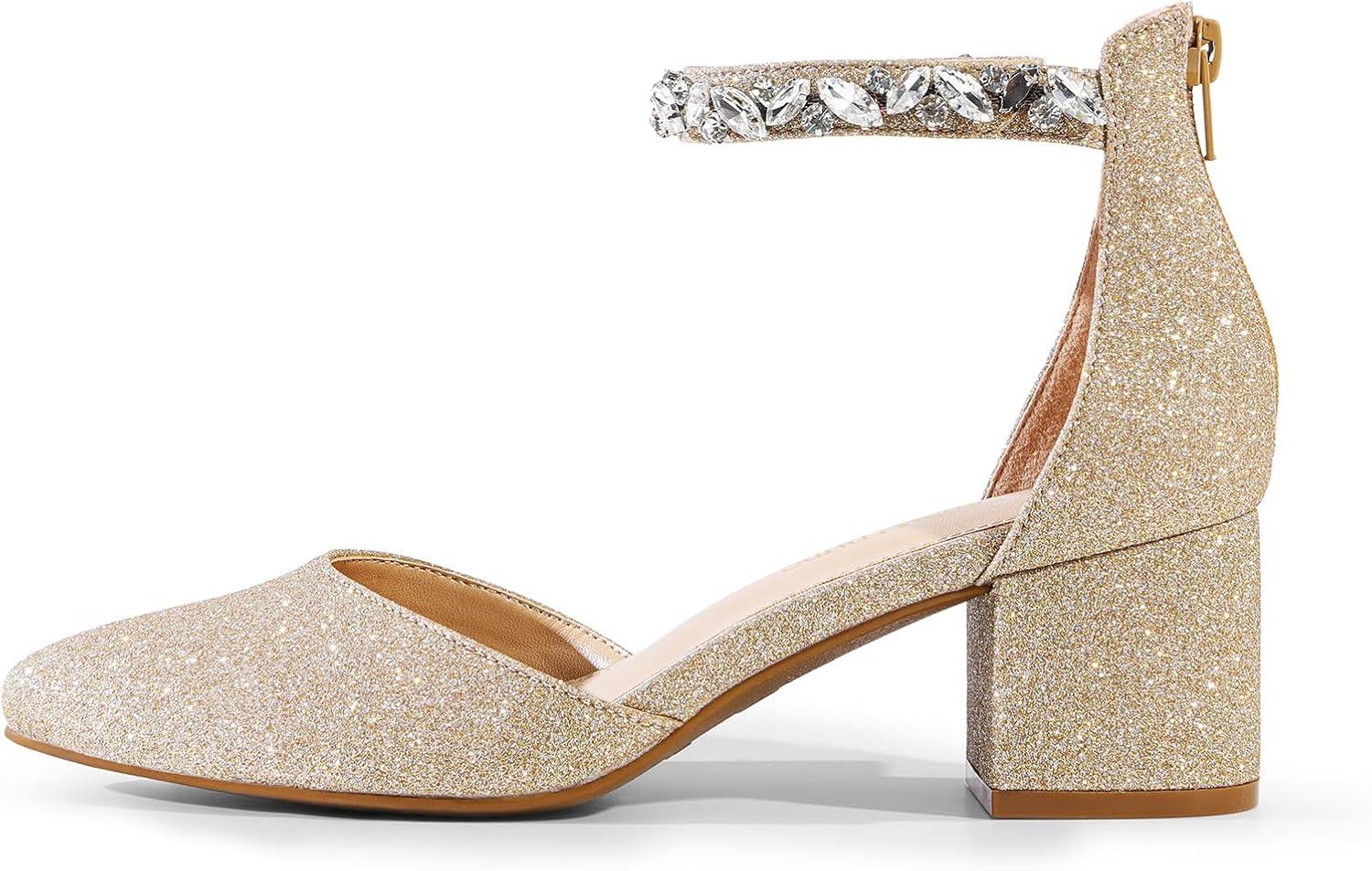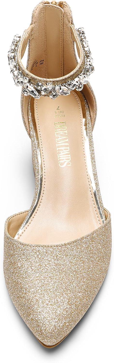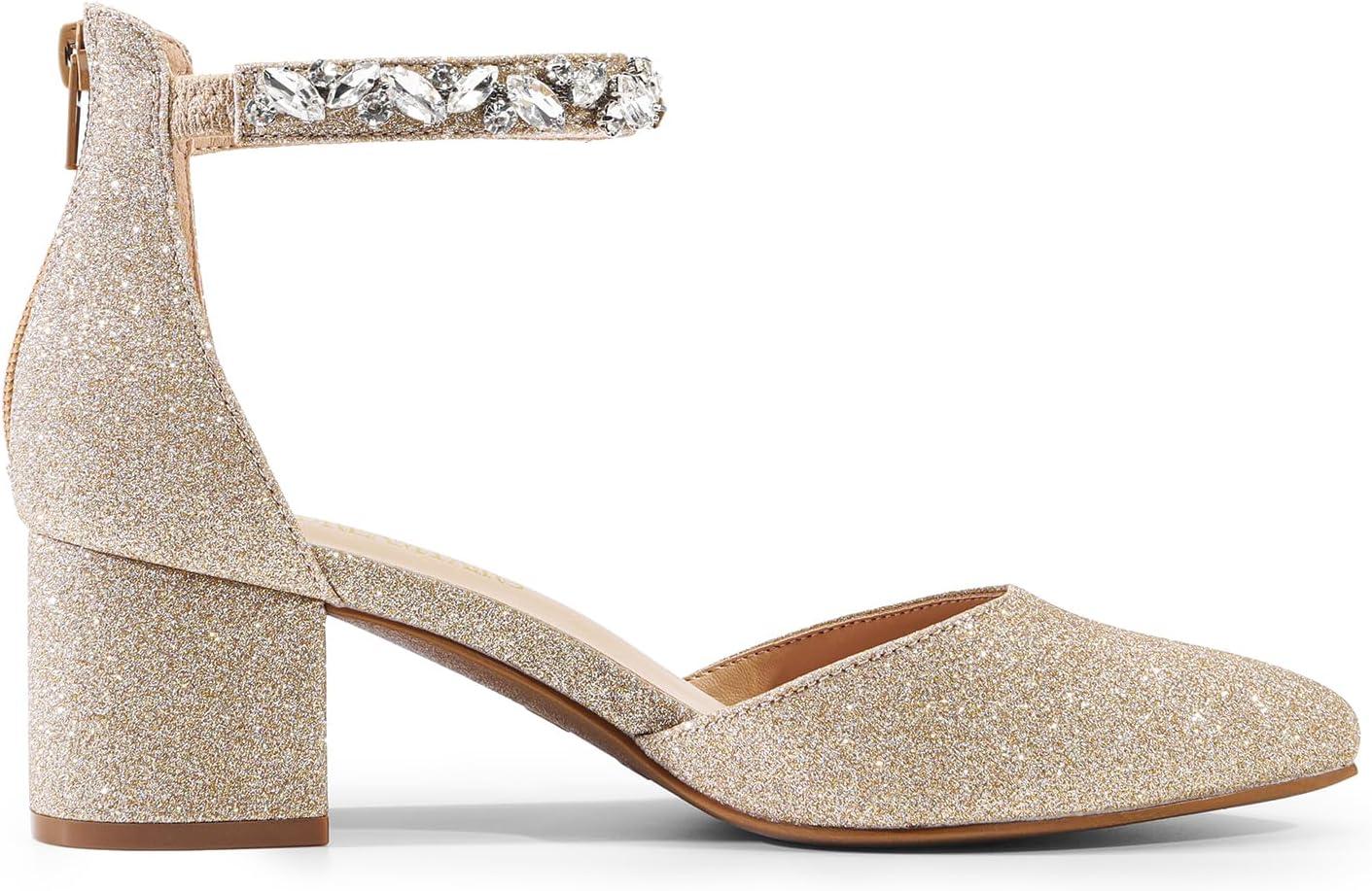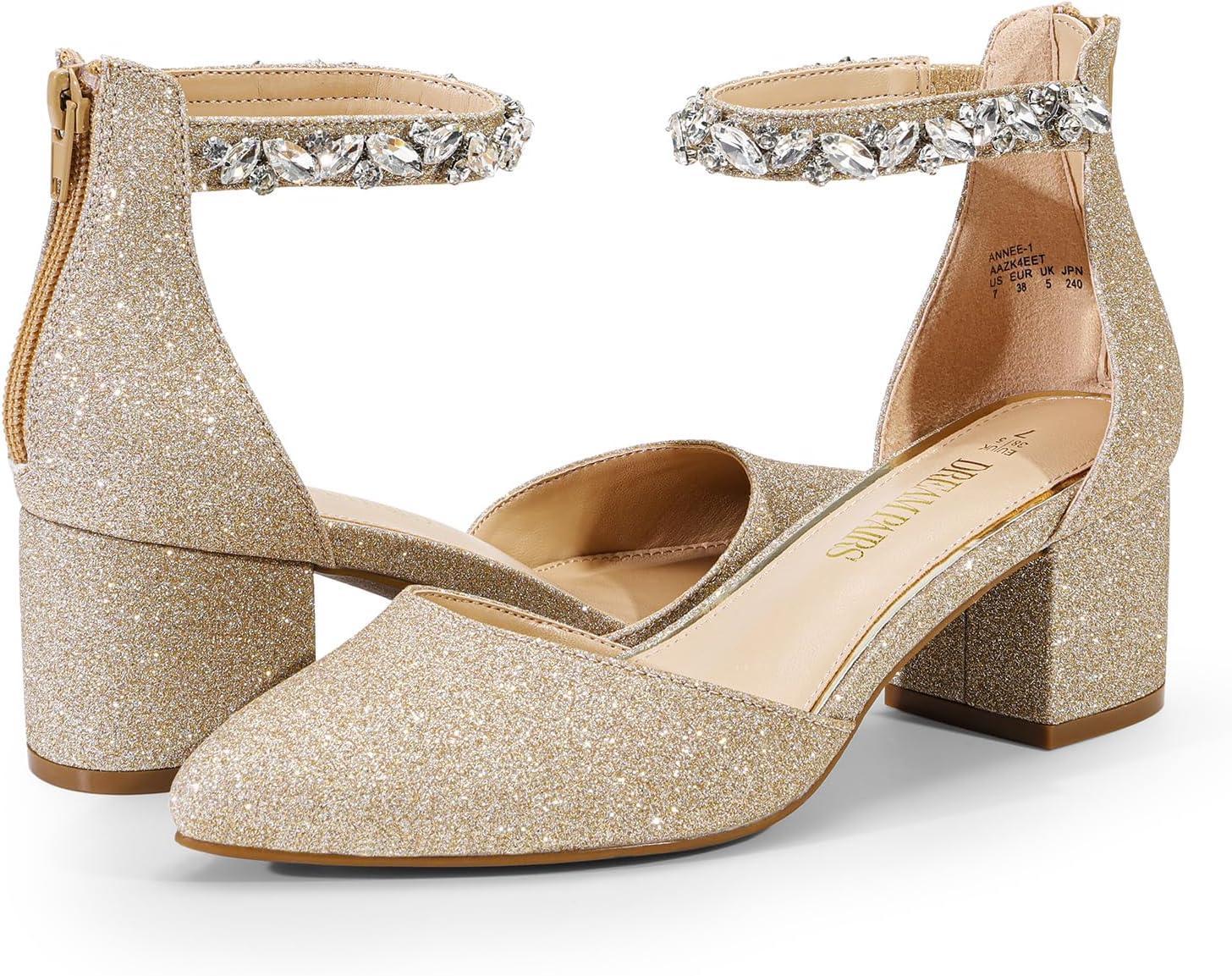 DREAM PAIRS ANNEE Pointed Toe Low Chunky Heels Pump Shoes(Gold-rhinestone)