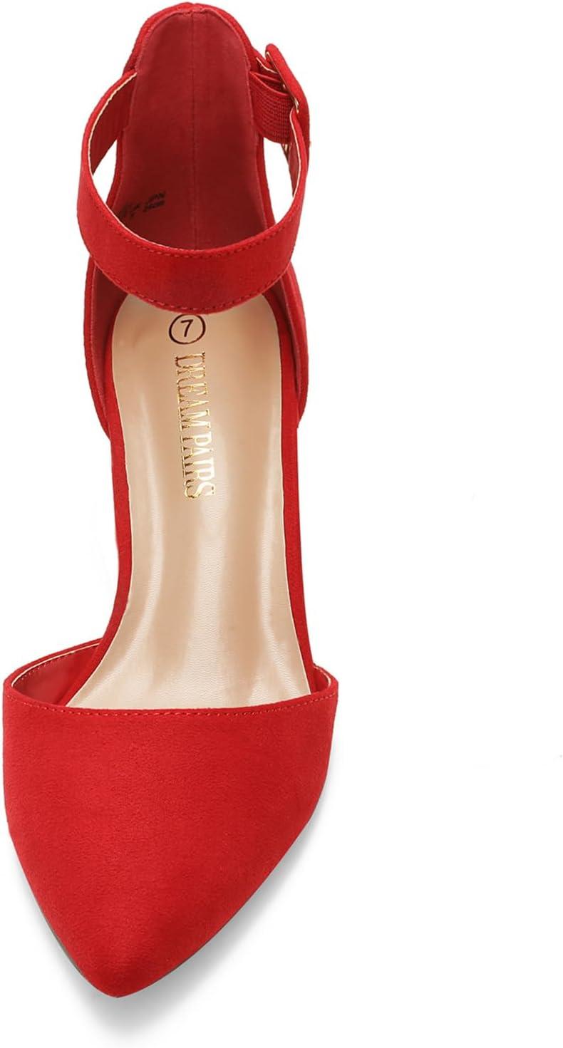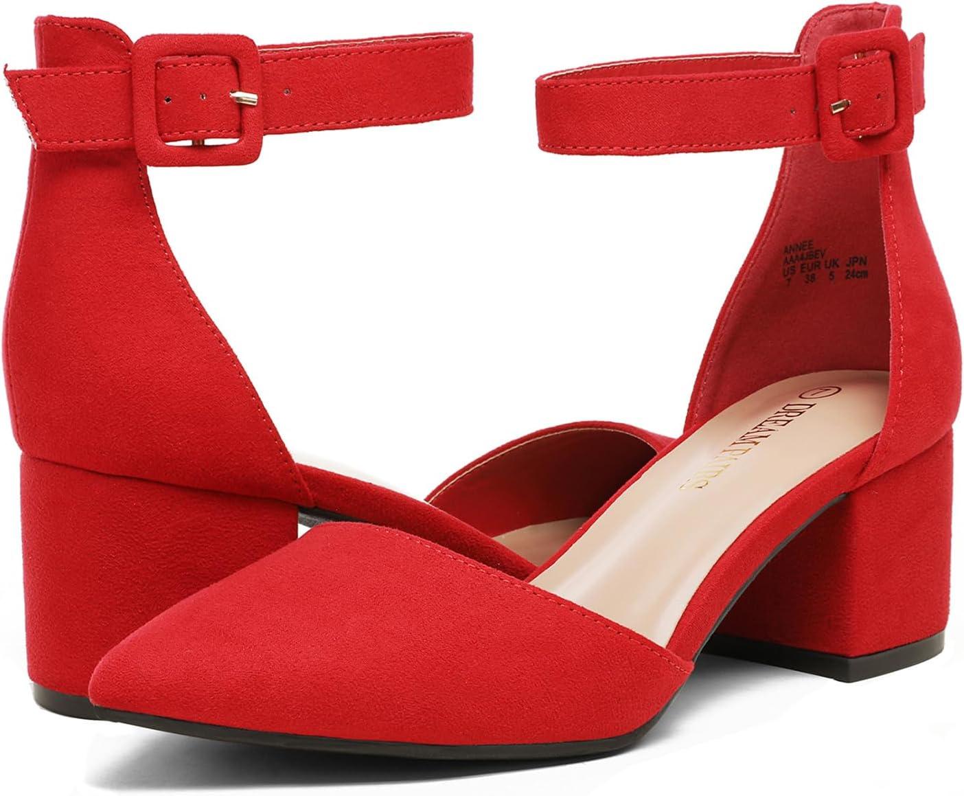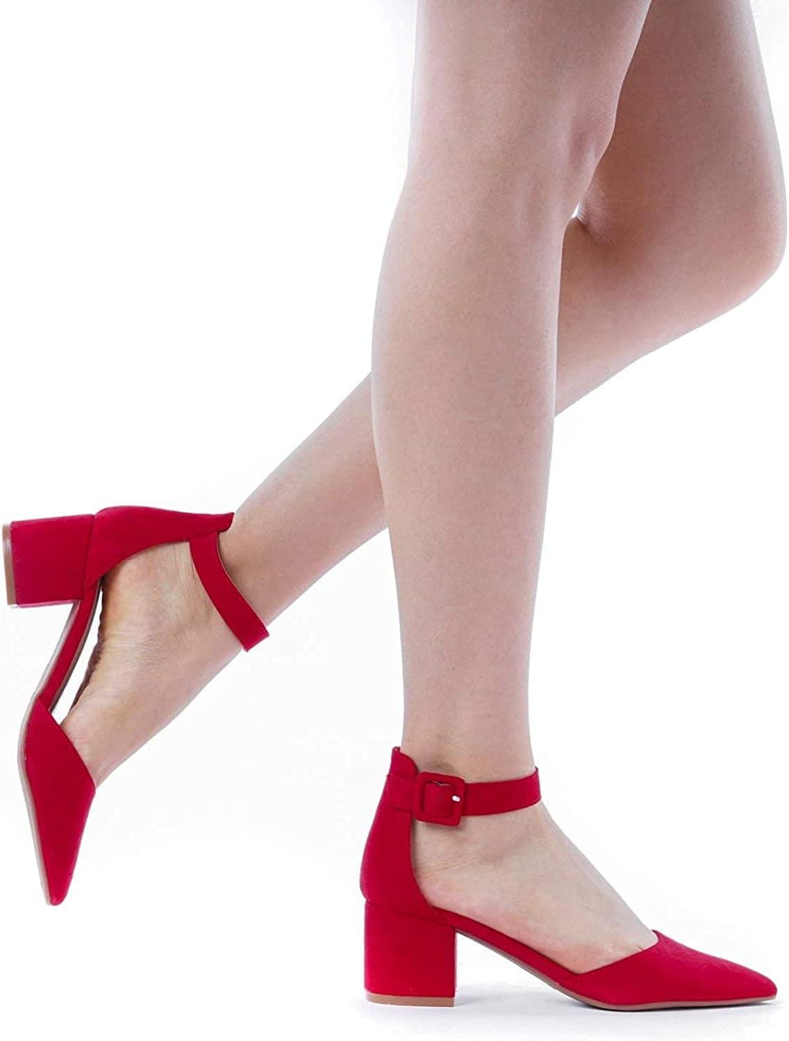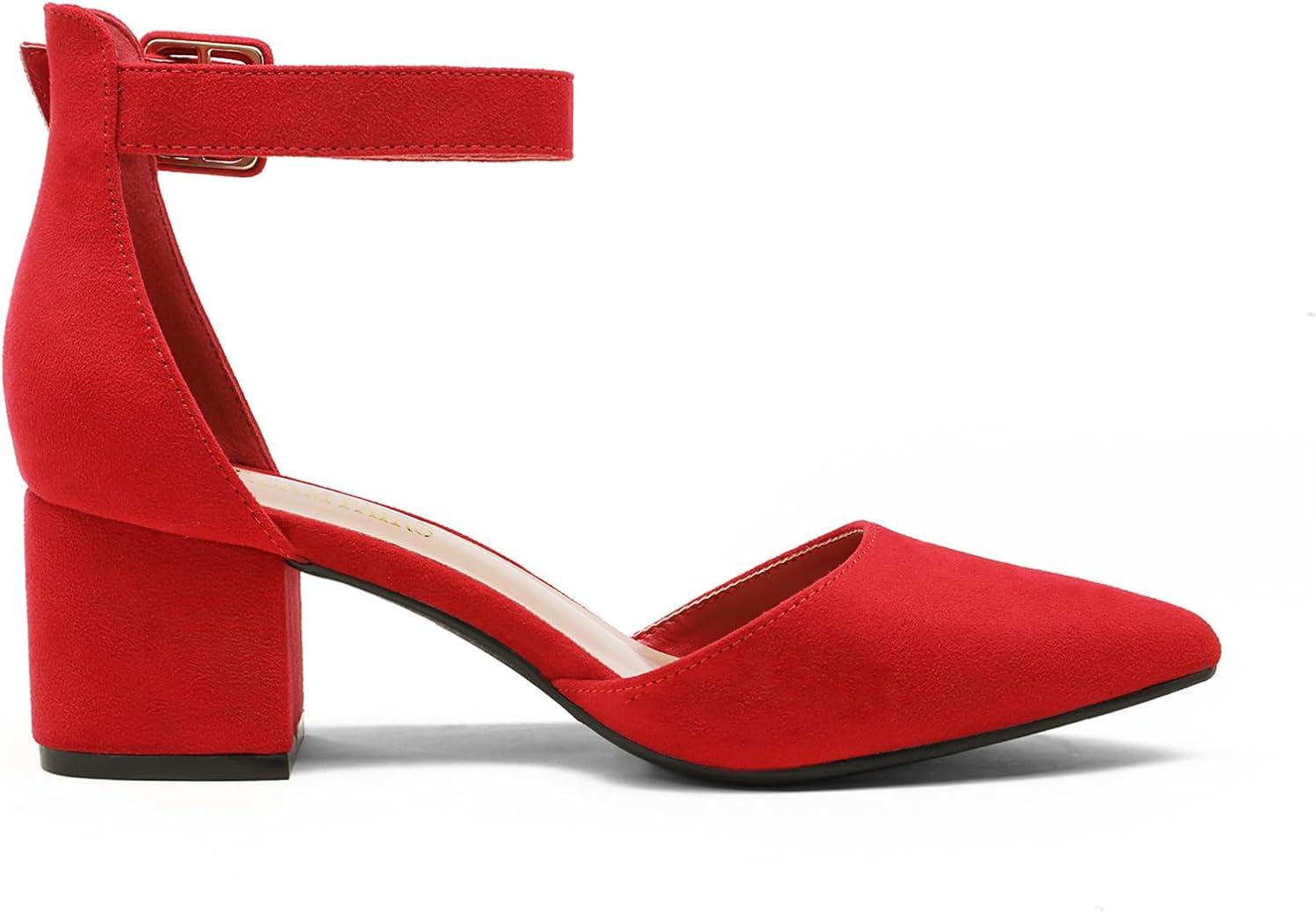 DREAM PAIRS ANNEE Pointed Toe Low Chunky Heels Pump Shoes(Red/Suede)
