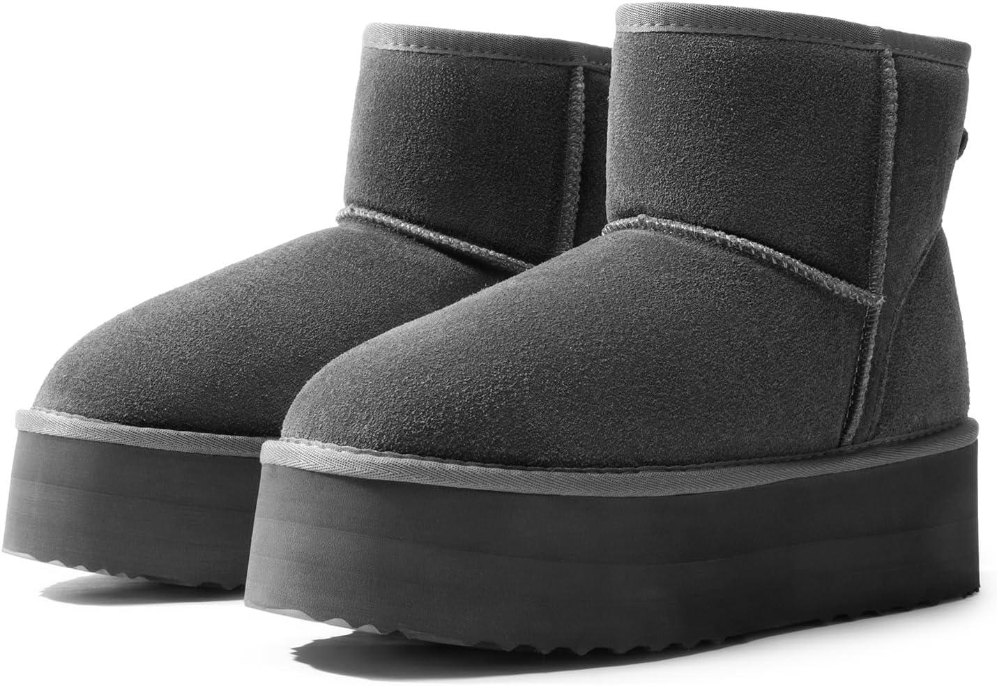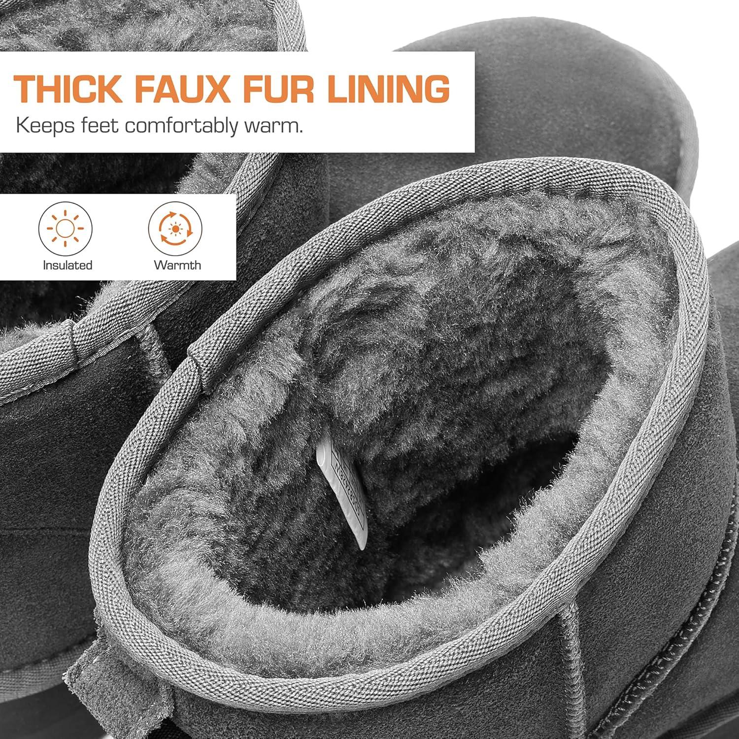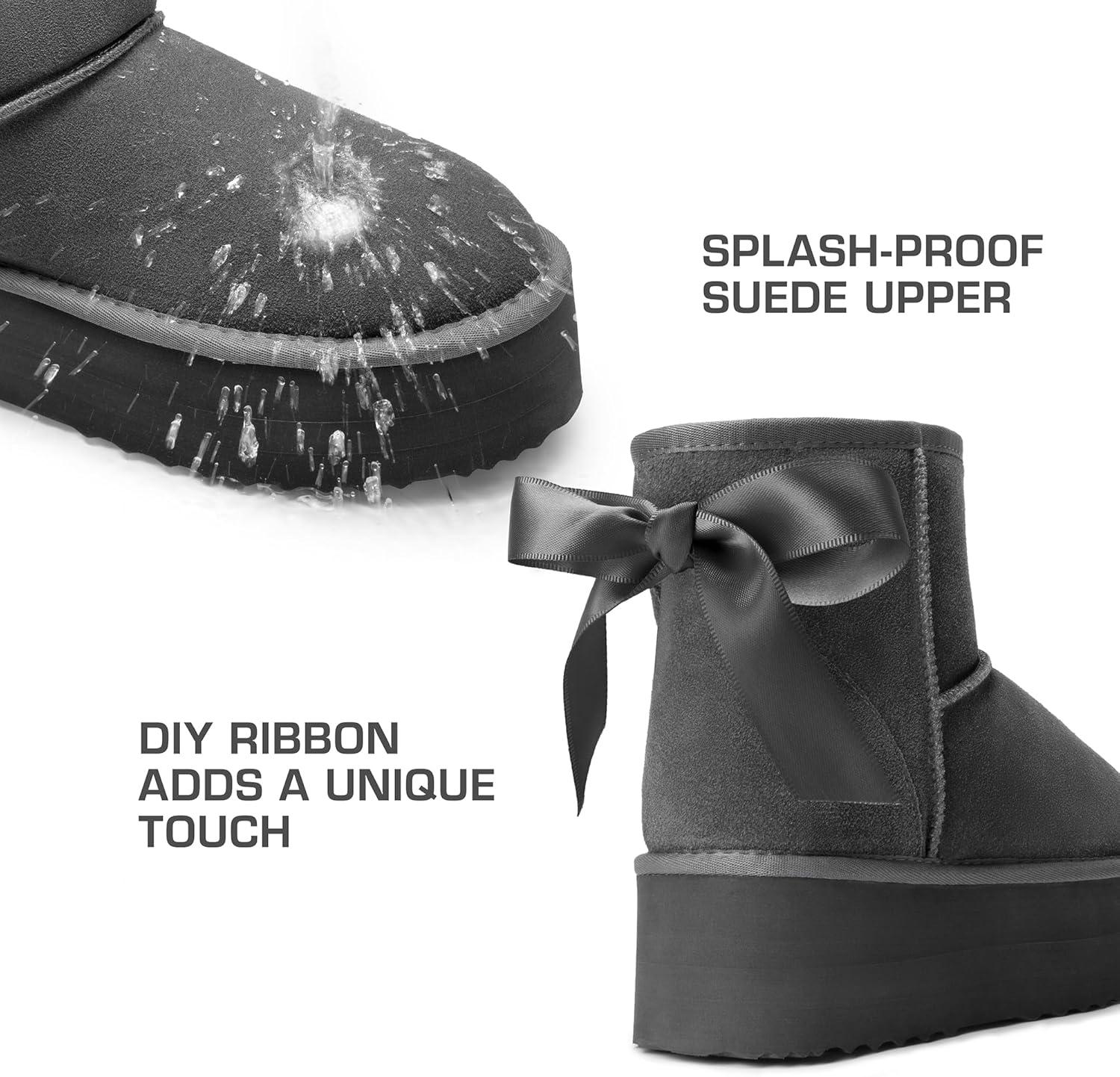 DREAM PAIRS Genuine Suede Classic Platform Boots for Women Water Resistant FuzzyClassic Ankle Winter Snow Low Boots with DIY Bows Faux Fur Lining Memory Foam Anti-Slip(Grey)