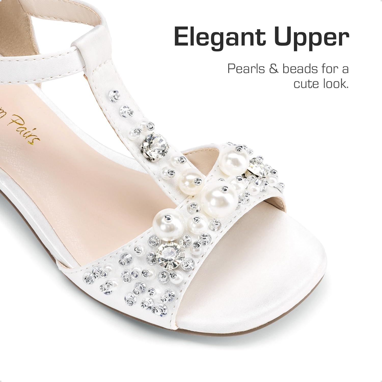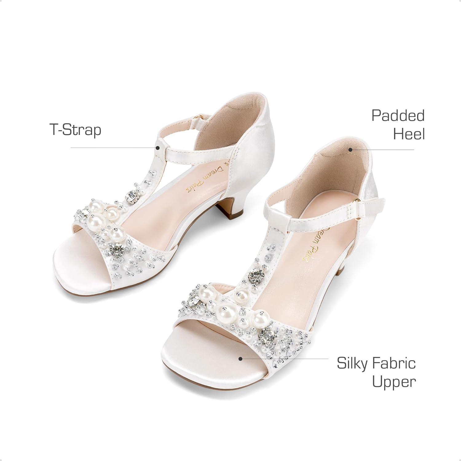 DREAM PAIRS Girls Sandals Ankle Strap T-Strap Low Heel Pearl Bow Flower Pump Dress Wedding Party Shoes for Little Kid/Big Kid(Ivory)