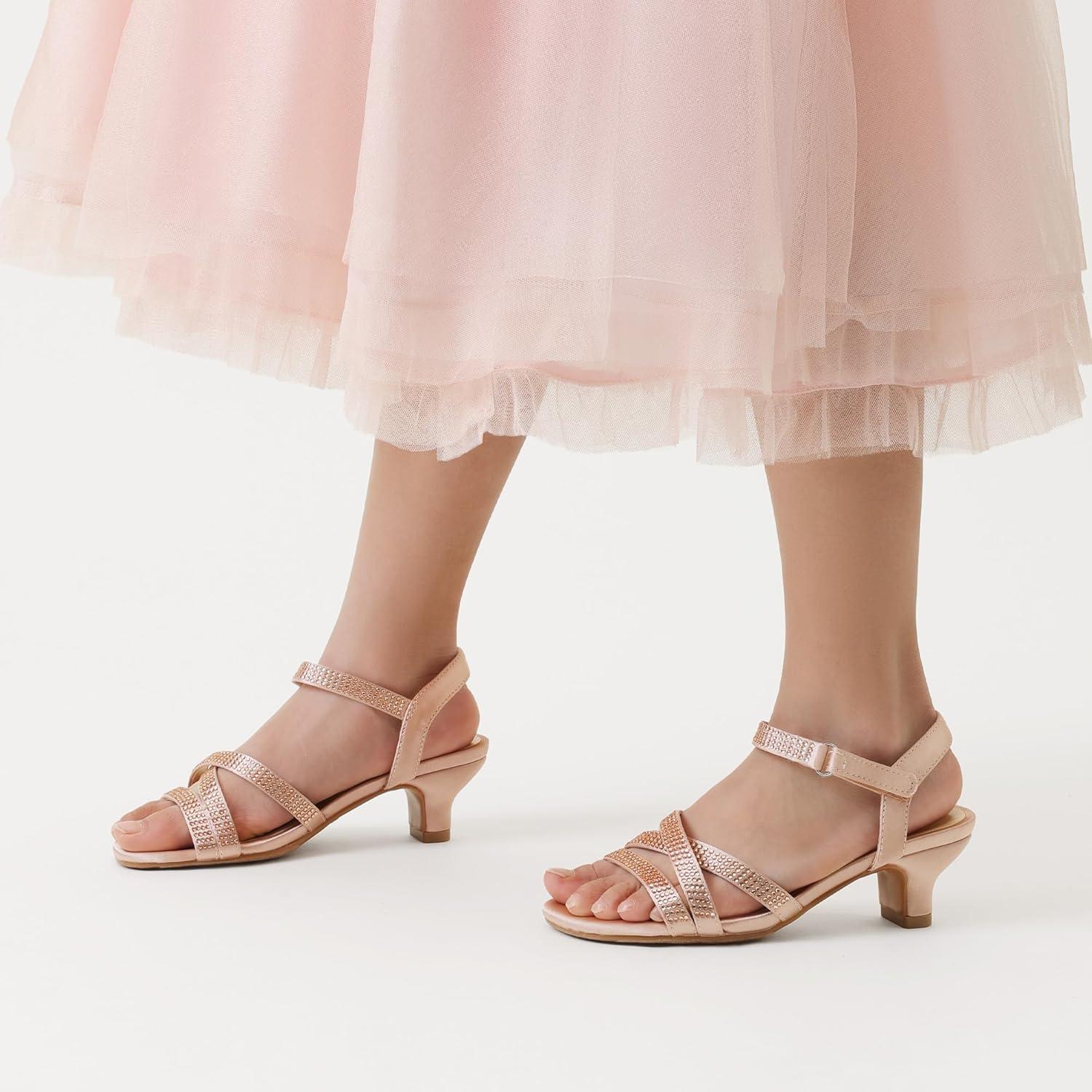 DREAM PAIRS Girls Sandals Low Heel Dress Open Toe Sandals Flower Wedding Party for Little Kid/Big Kid(Champagne-satin)