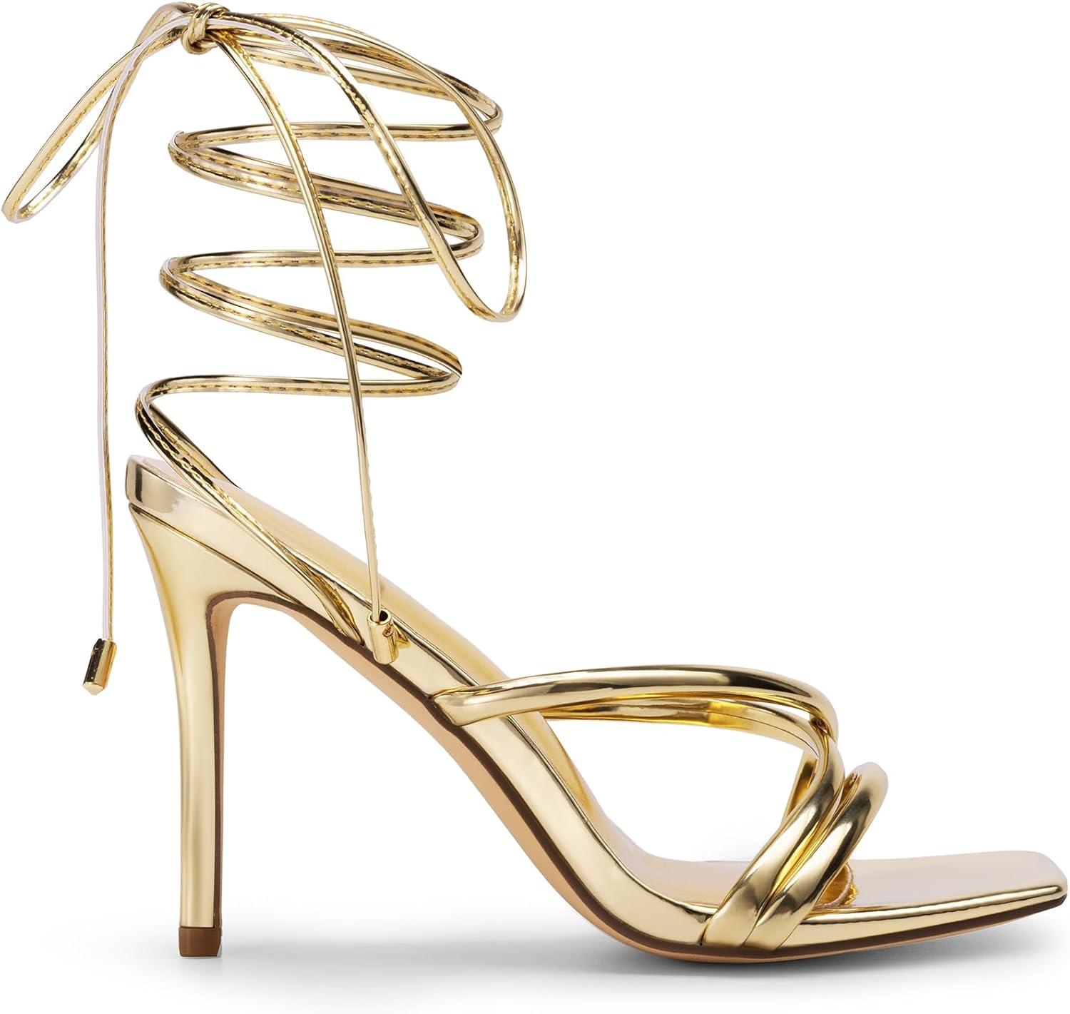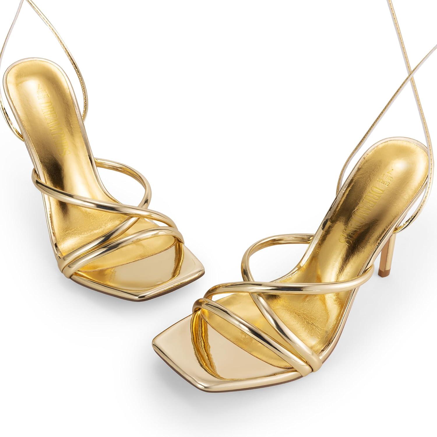 DREAM PAIRS Heels for Women Strappy High Stiletto Lace Up Heeled Sandals Square Open Toe Heels for Prom Party Dating(Gold-pu)