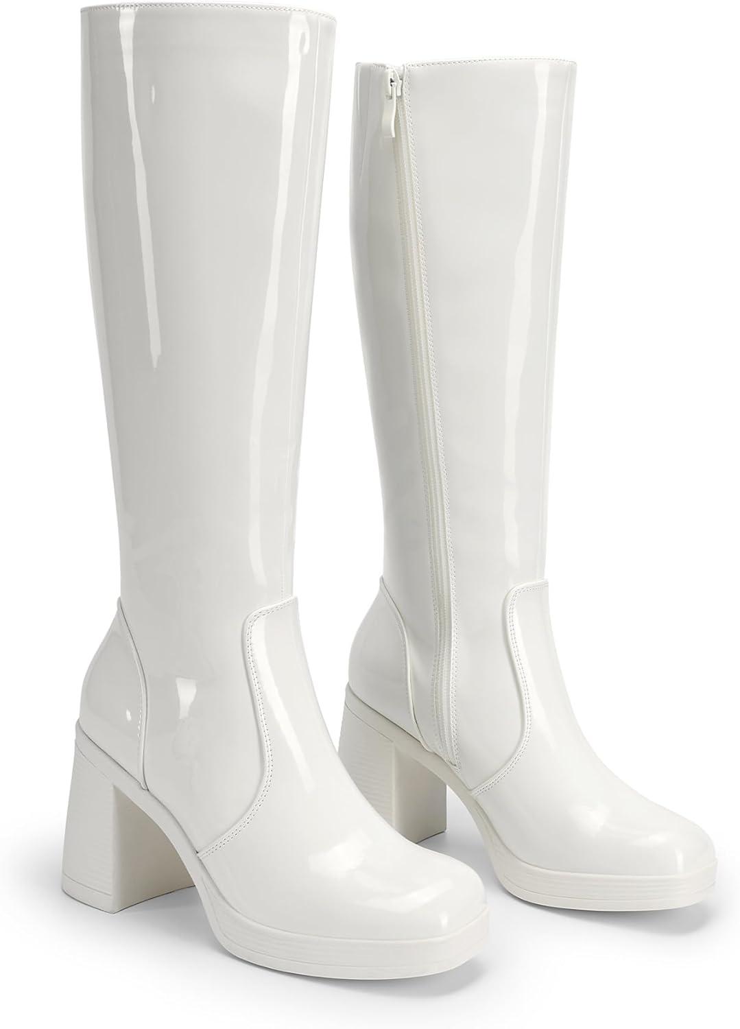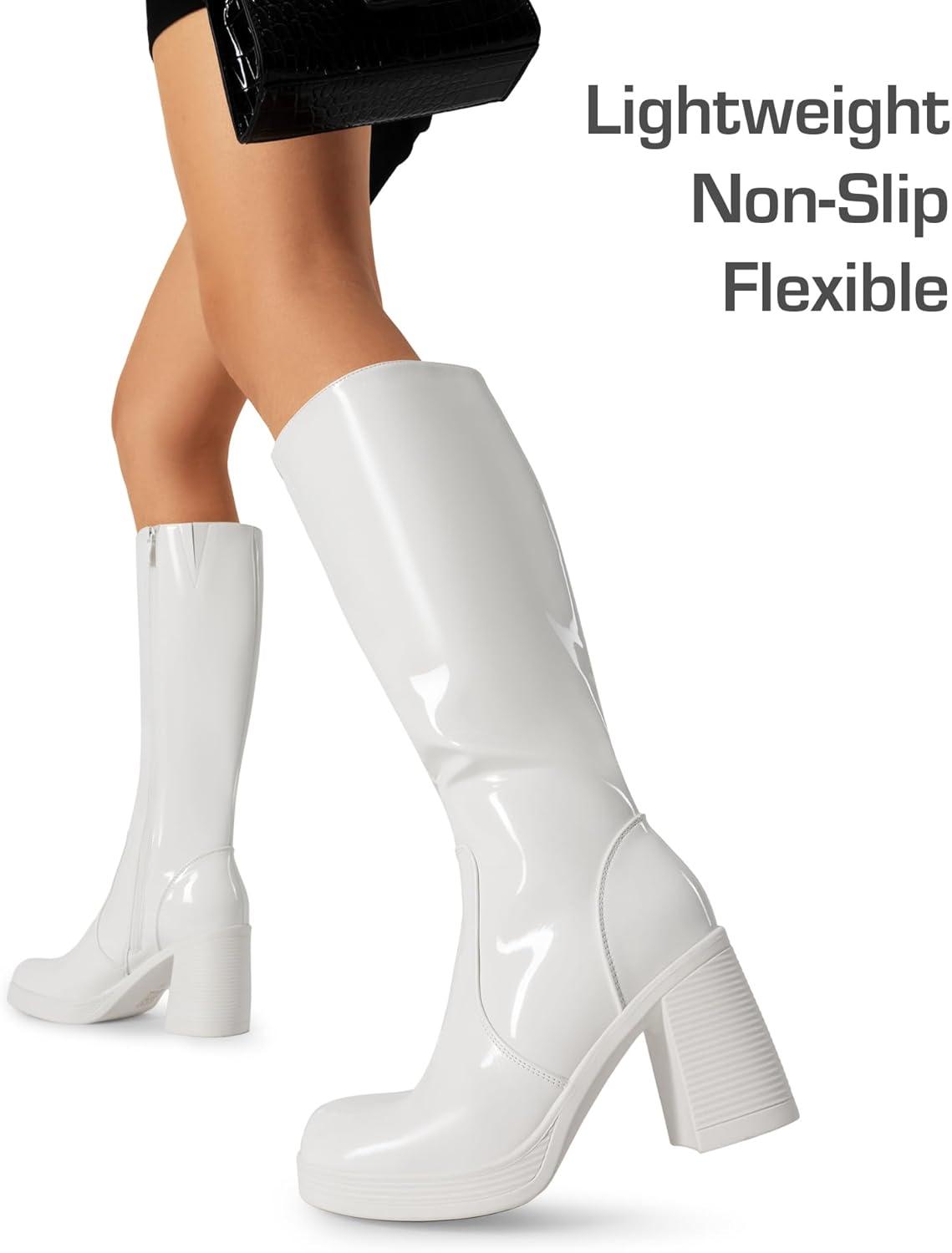 DREAM PAIRS Knee High Boots for Women Platform Square Toe Chunky Block Heeled Stylish Comfortable Tall Boots with Side Zipper(White-pat)