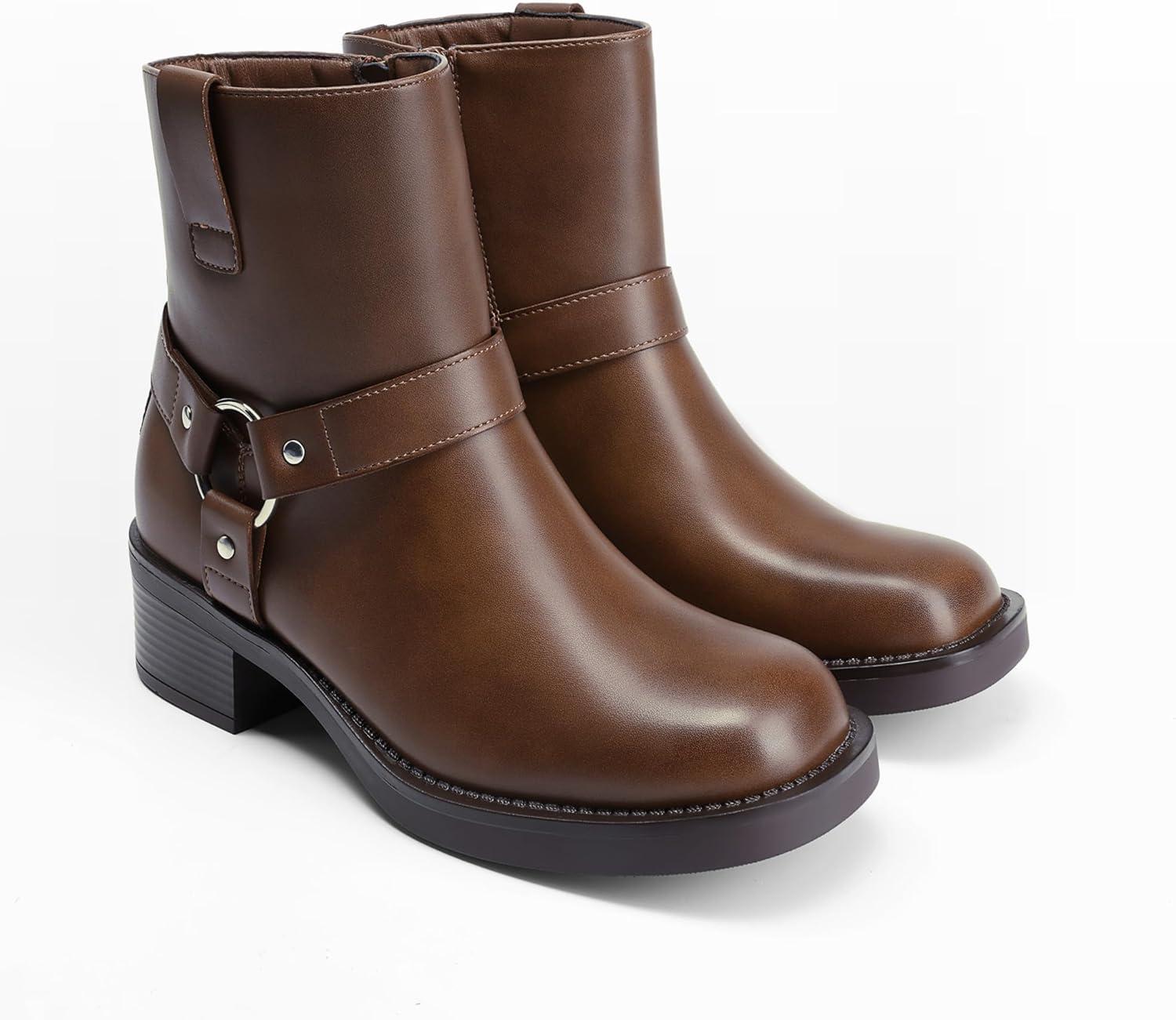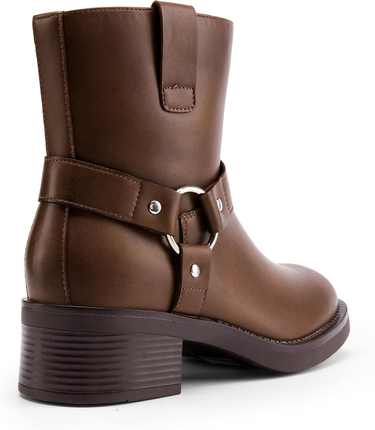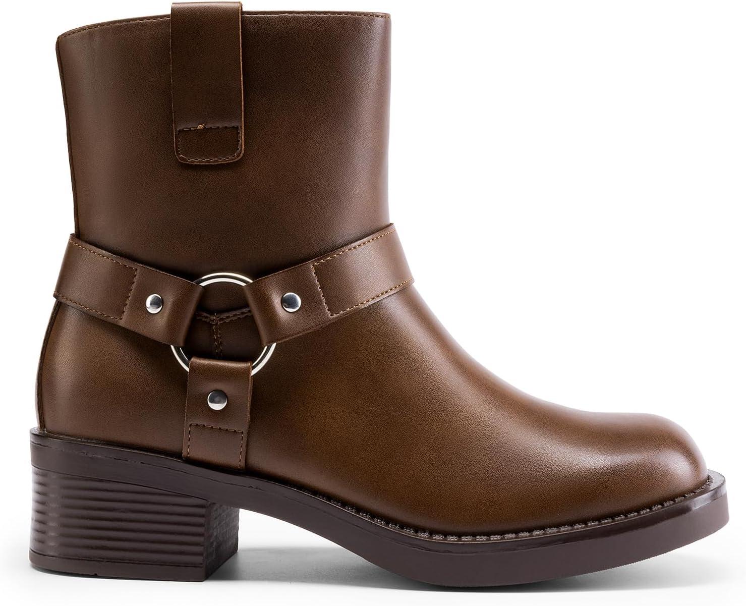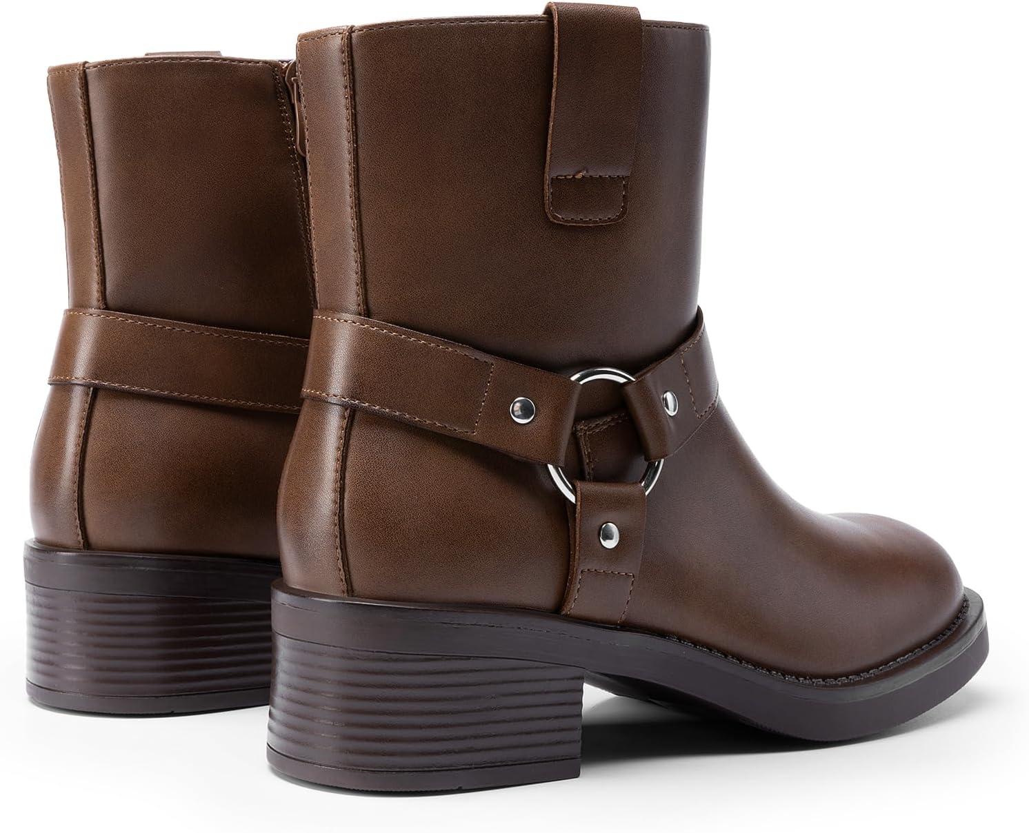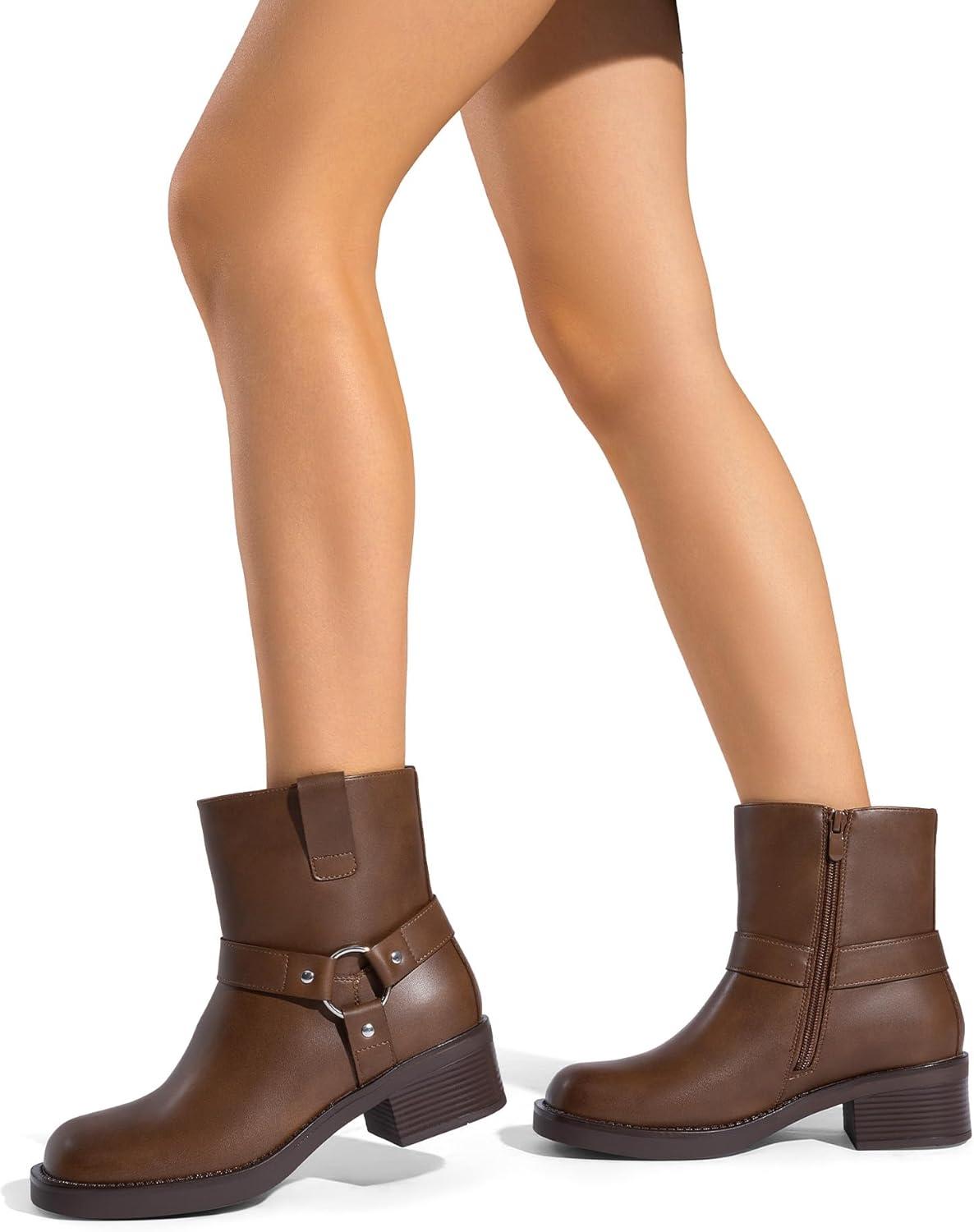 DREAM PAIRS Women’s Ankle Booties Side Zipper Motorcycle Boots Square Toe Chunky Low Heel Fashion Buckles Biker Riding Boots(Tan)