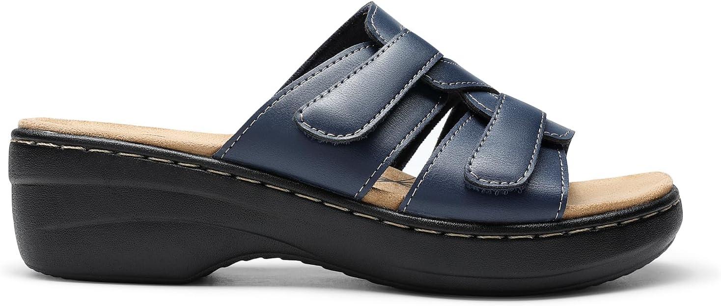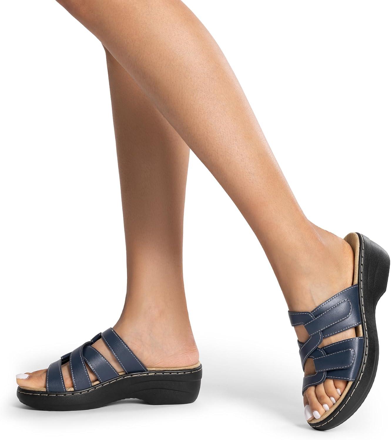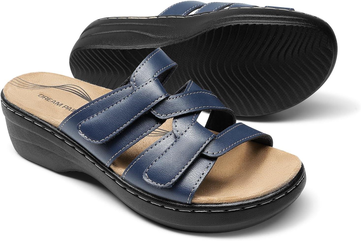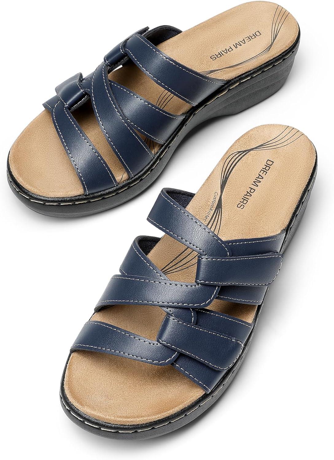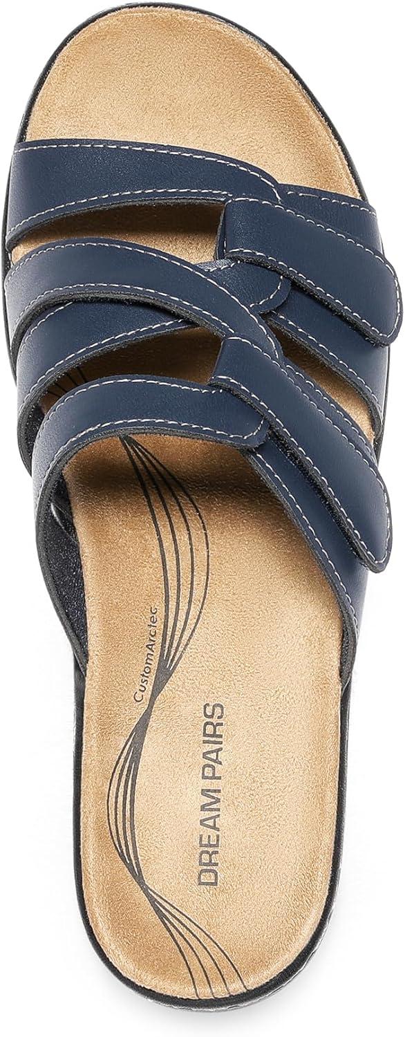 DREAM PAIRS Women’s Arch Support Slide Sandals Adjustable Straps Slip On Wedge Sandals Casual Comfort Lightweight Flat Slides(Navy)