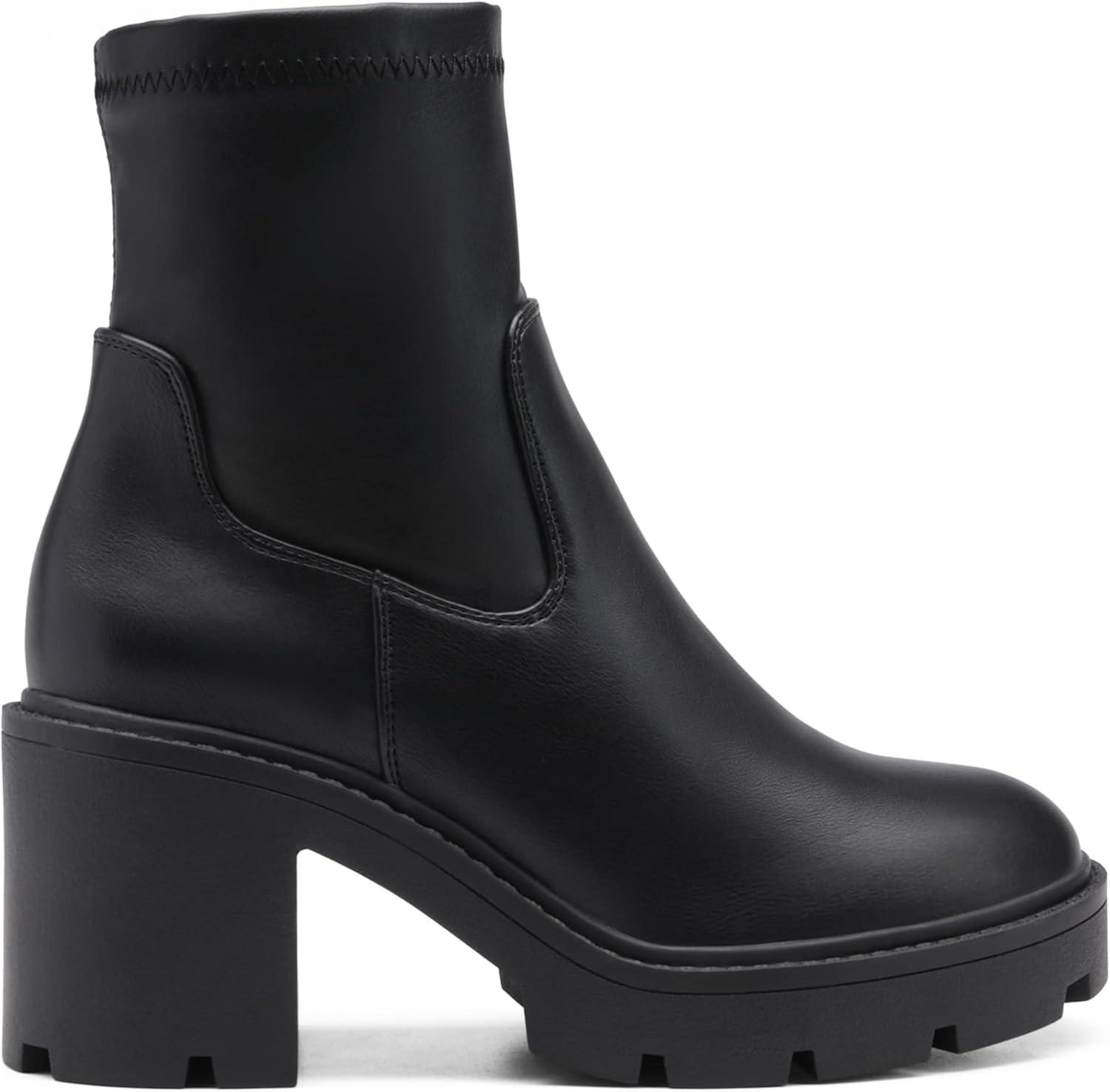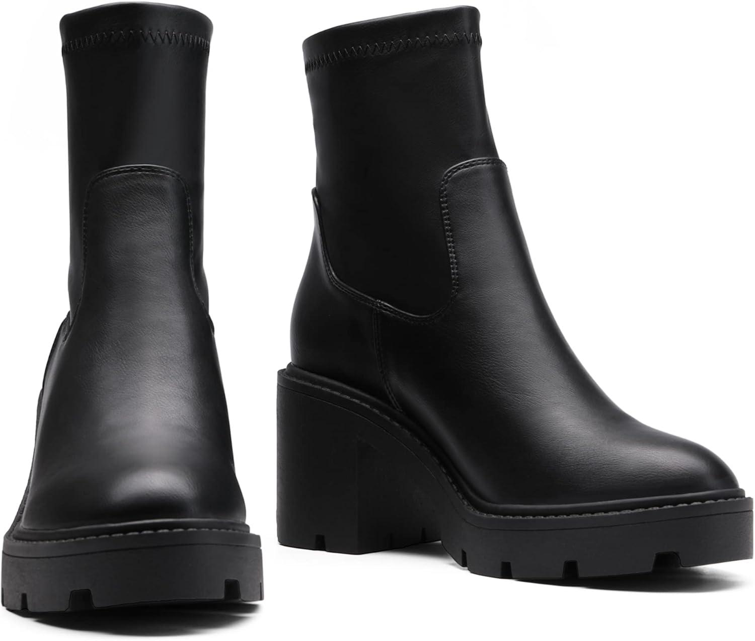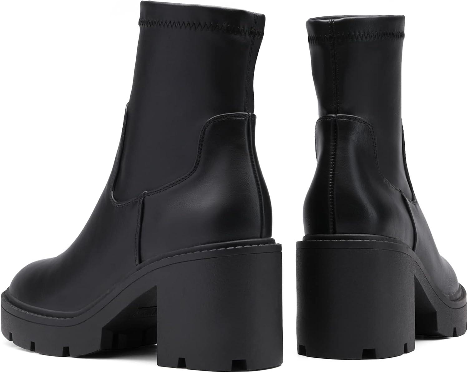 DREAM PAIRS Women’s Chelsea Platform Boots Elastic Chunky Heel Lug Sole Ankle Booties Shoes(Black/Pu)