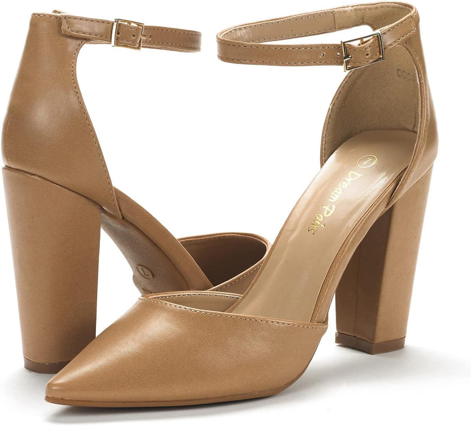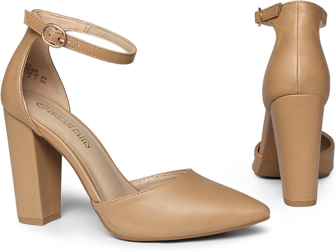 DREAM PAIRS Women’s Coco High Heels Chunky Block Pumps Pointed Closed Toe Ankle Strap Dress Shoes(Nude/Pu)