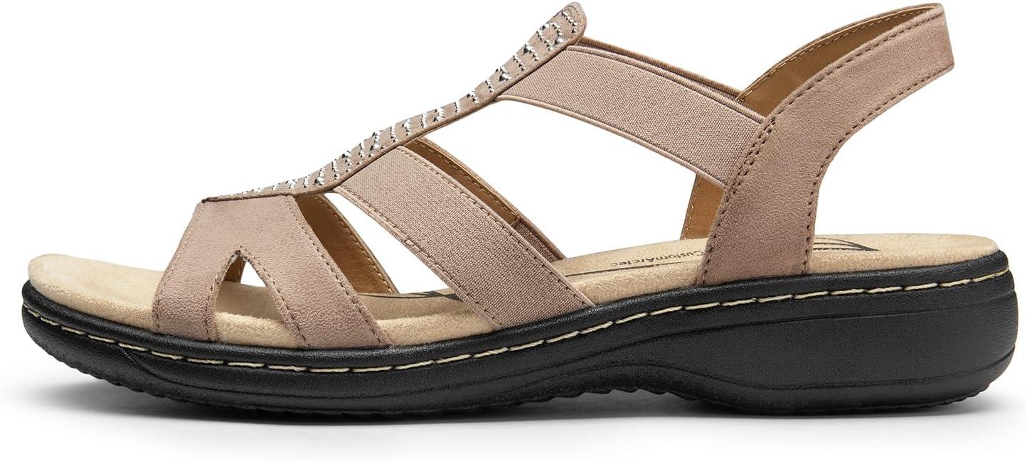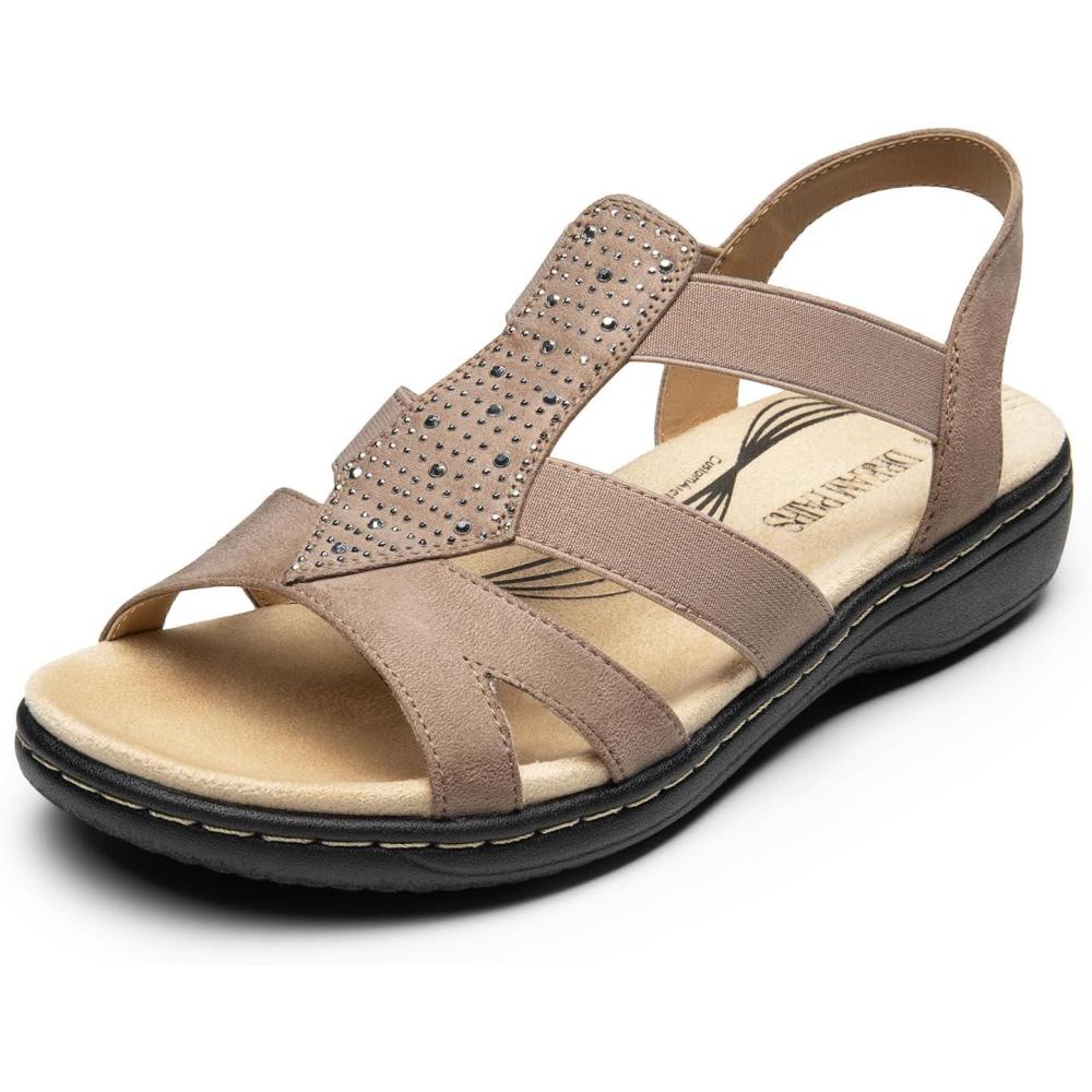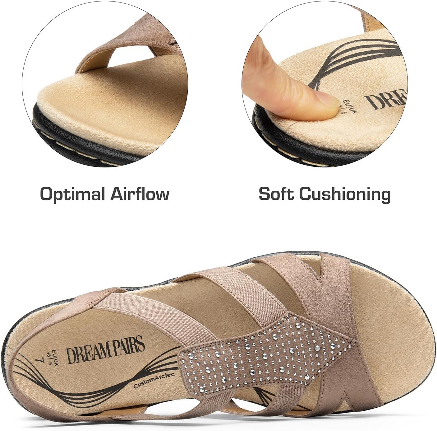 DREAM PAIRS Women’s Comfortable Arch Support Dressy Flat Sandals Elastic Open Toe Walking Shoes for Summer(Taupe)