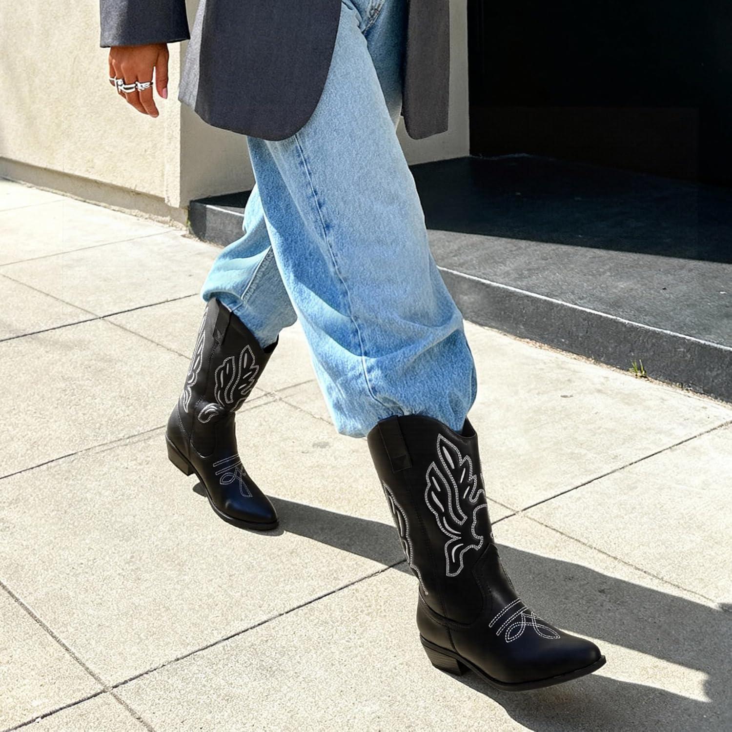 DREAM PAIRS Women’s Cowboy Boots Mid Calf Cowgirl Boots Embroidery Stitched Western Boots(Black-pu)