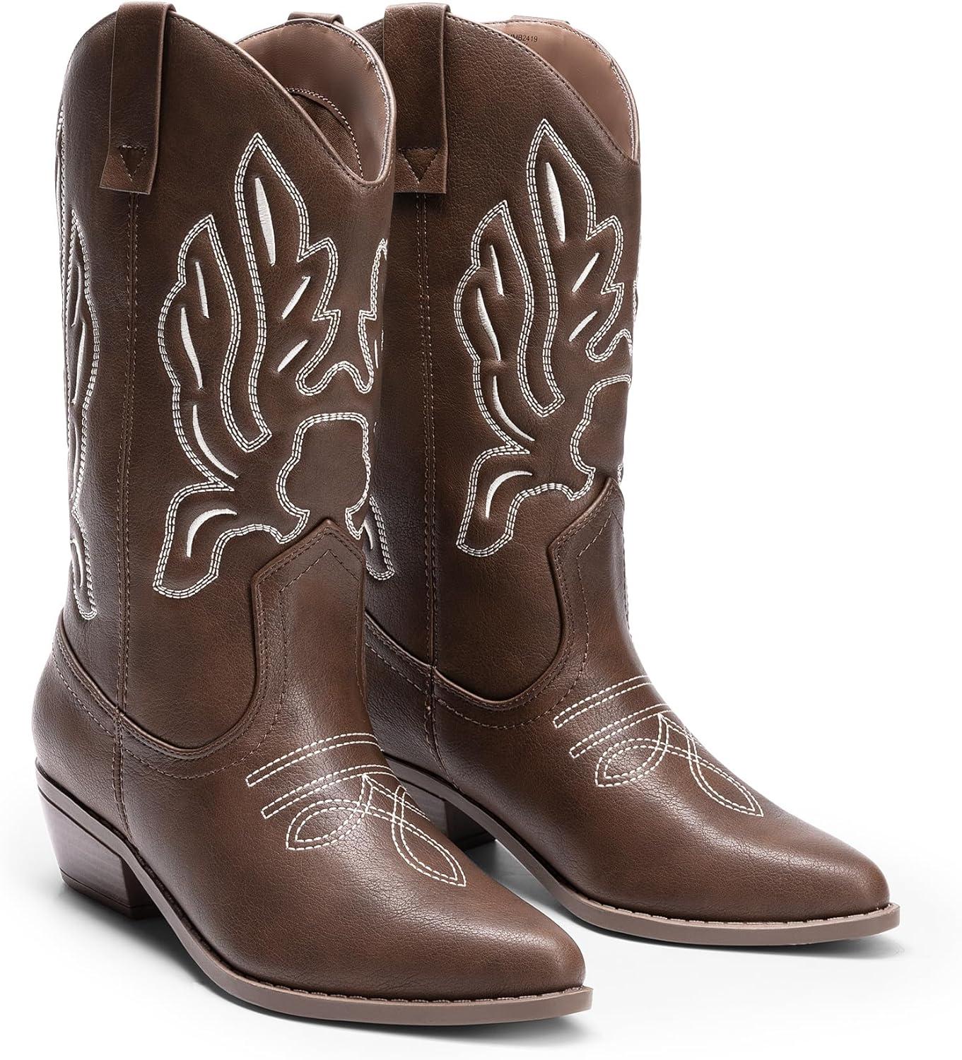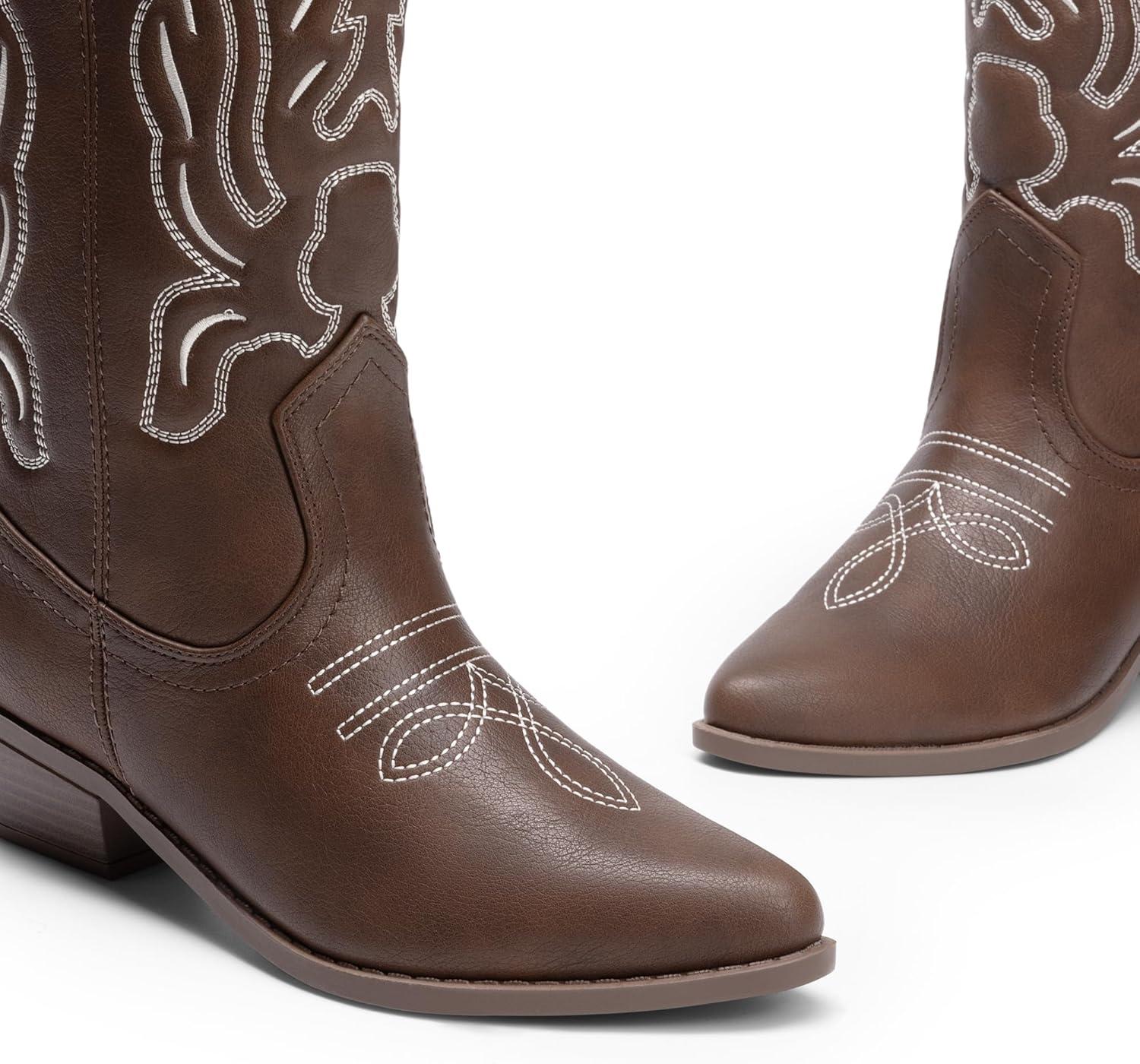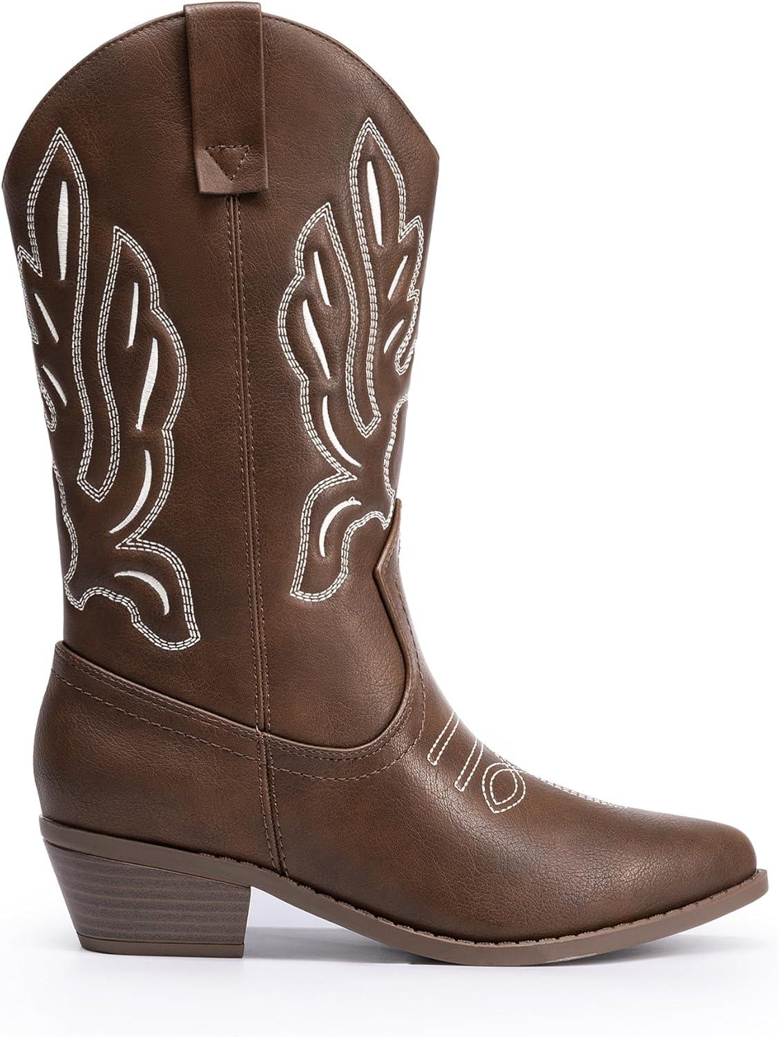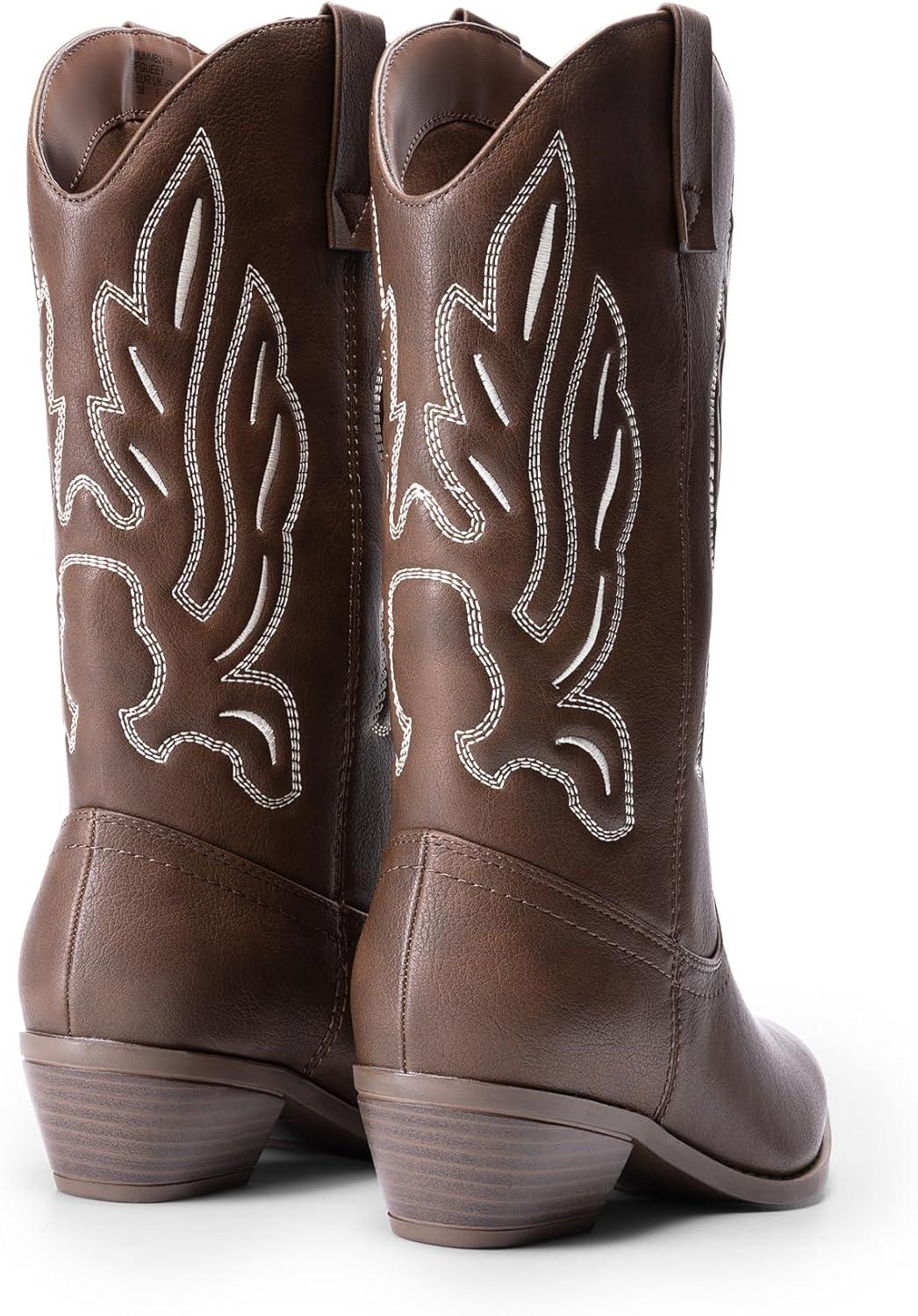 DREAM PAIRS Women’s Cowboy Boots Mid Calf Cowgirl Boots Embroidery Stitched Western Boots(Brown-pu)