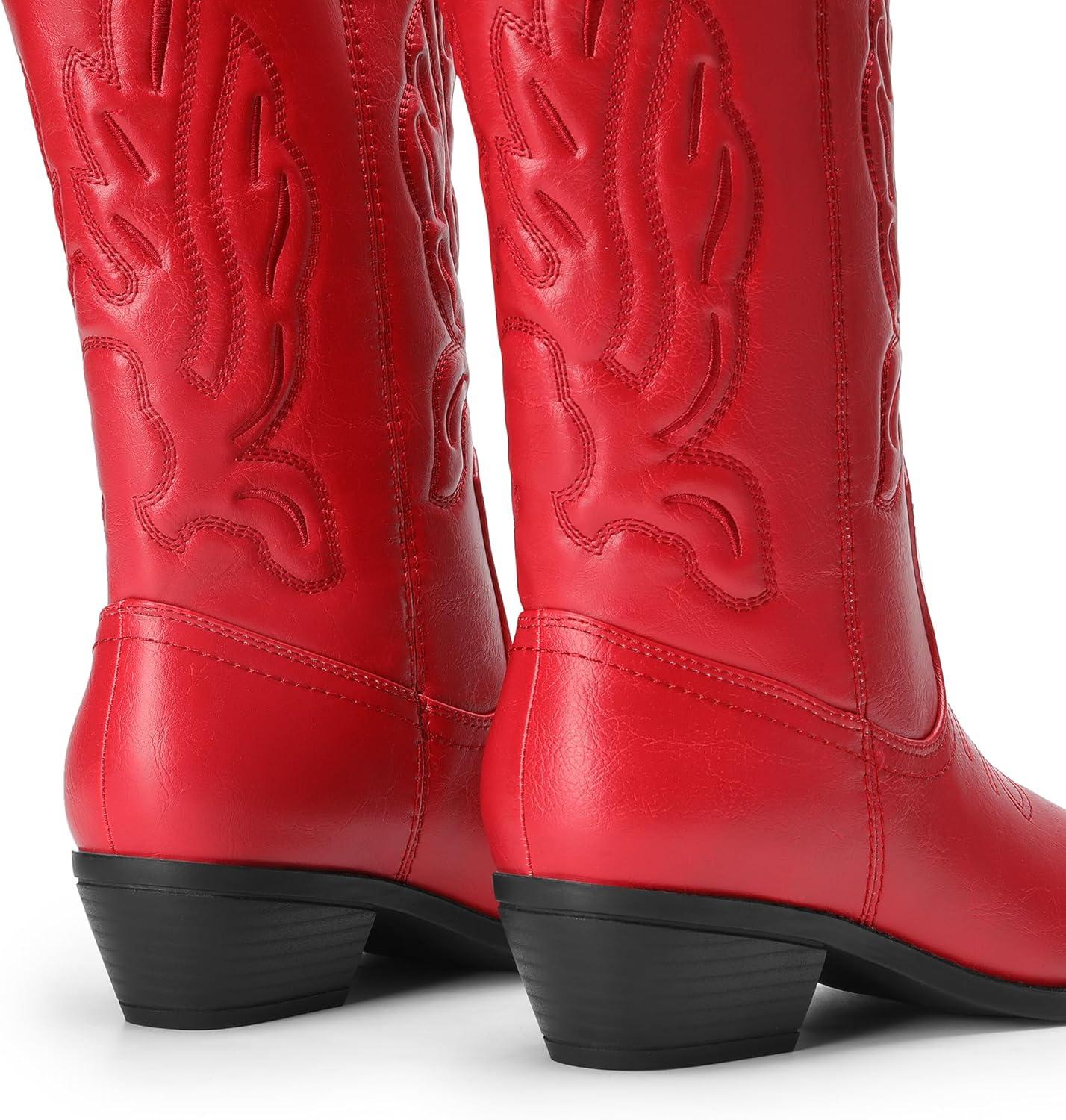 DREAM PAIRS Women’s Cowboy Boots Mid Calf Cowgirl Boots Embroidery Stitched Western Boots(Red)