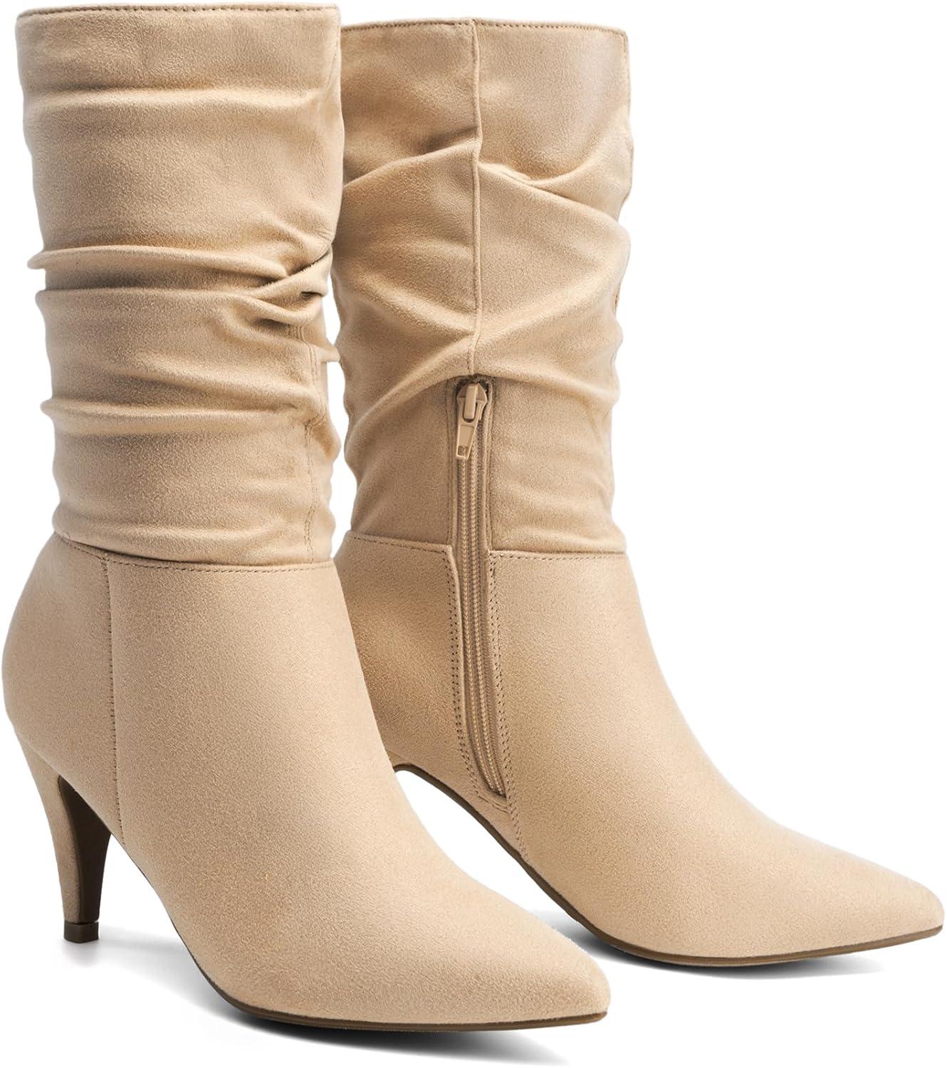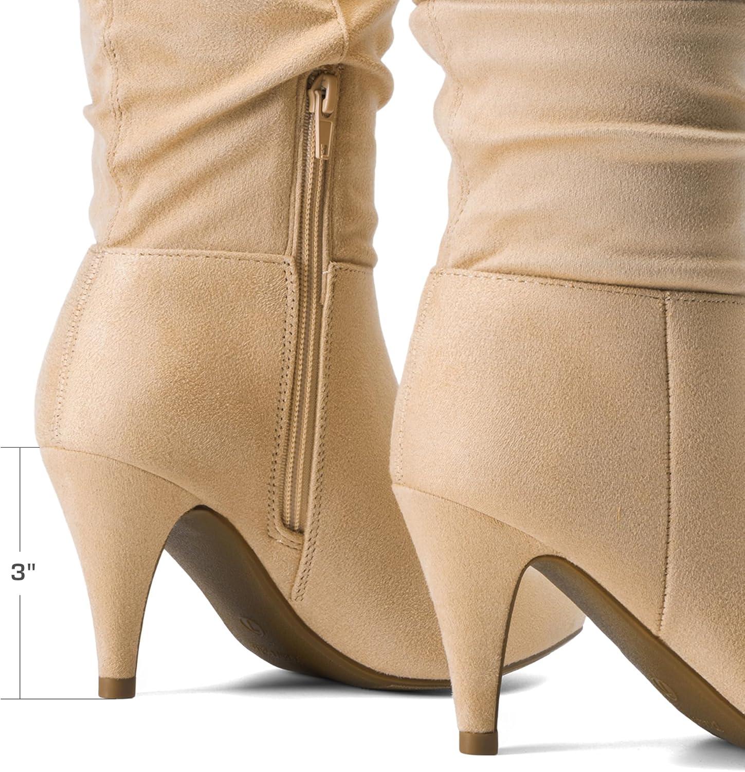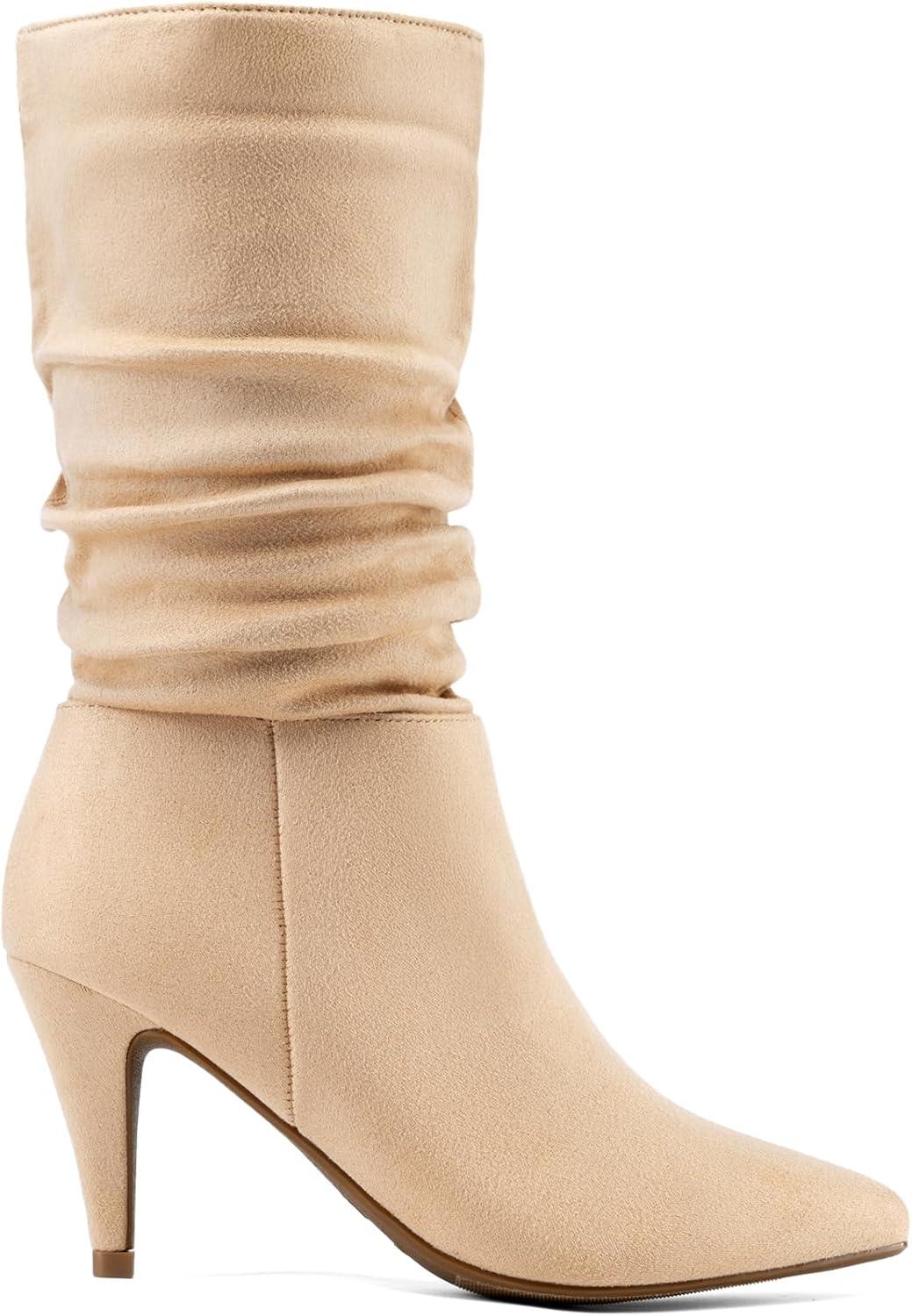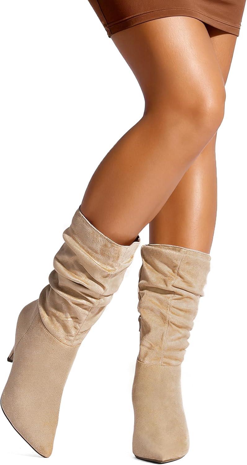 DREAM PAIRS Women’s High Heel Mid Calf Boots Slouchy Pointed Toe Fall Boots(Nude/K)