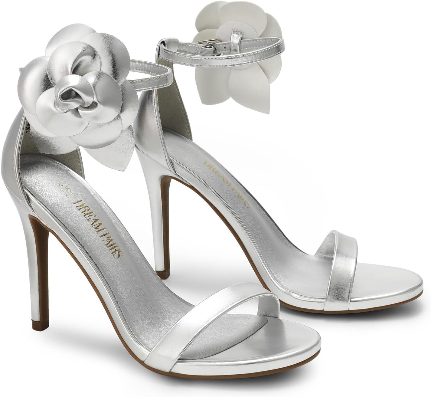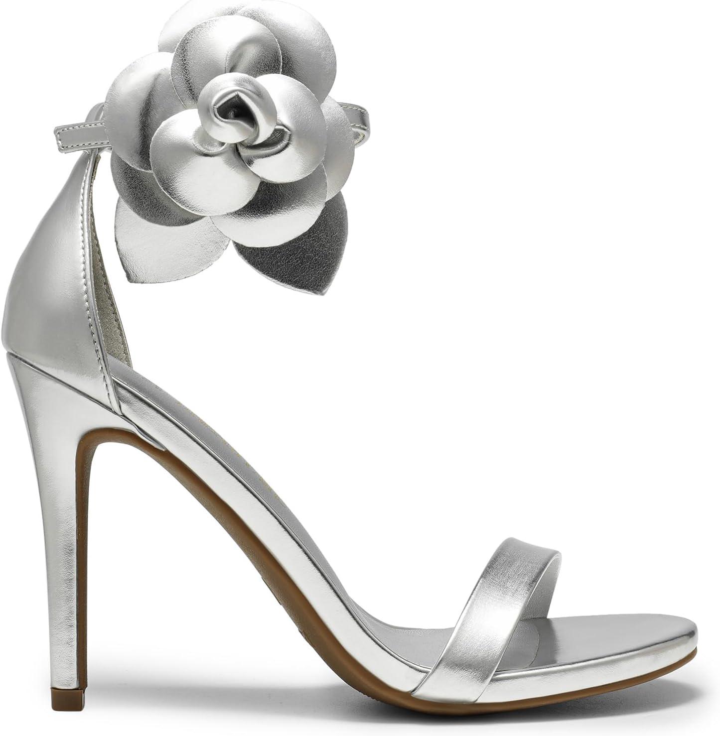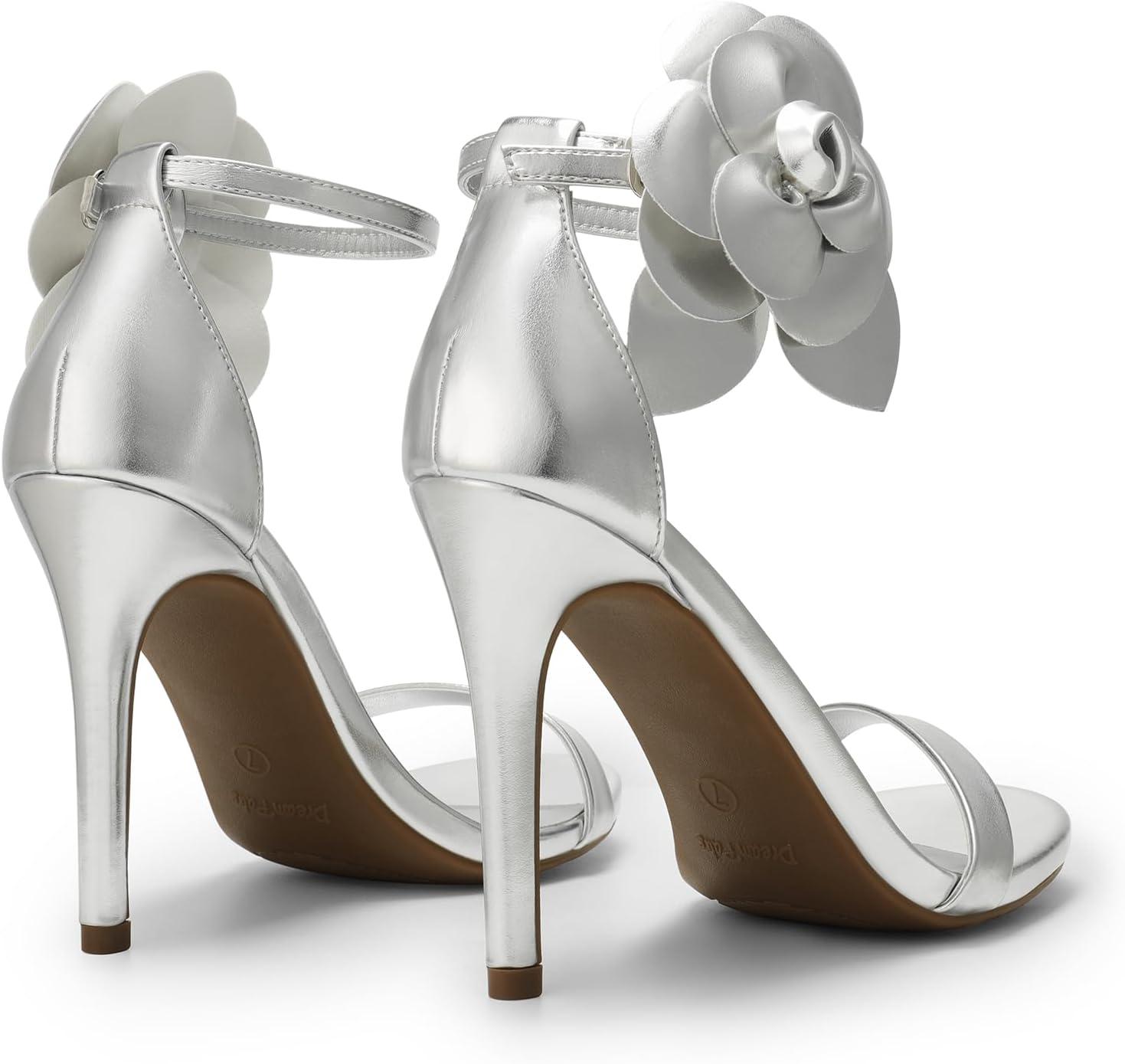 DREAM PAIRS Women’s High Heels Flower Ankle Strap Stilettos Round Open Toe Dressy Sexy Sandals(Silver-pu)