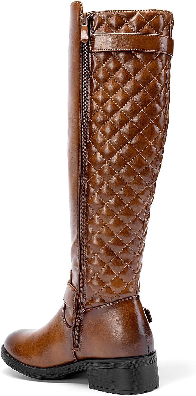 DREAM PAIRS Women’s Knee-High Boots Comfortable Chunky Block Heel Round Toe Side Zipper Riding Fashion Buckles Biker Motorcycle Boots(Tan)