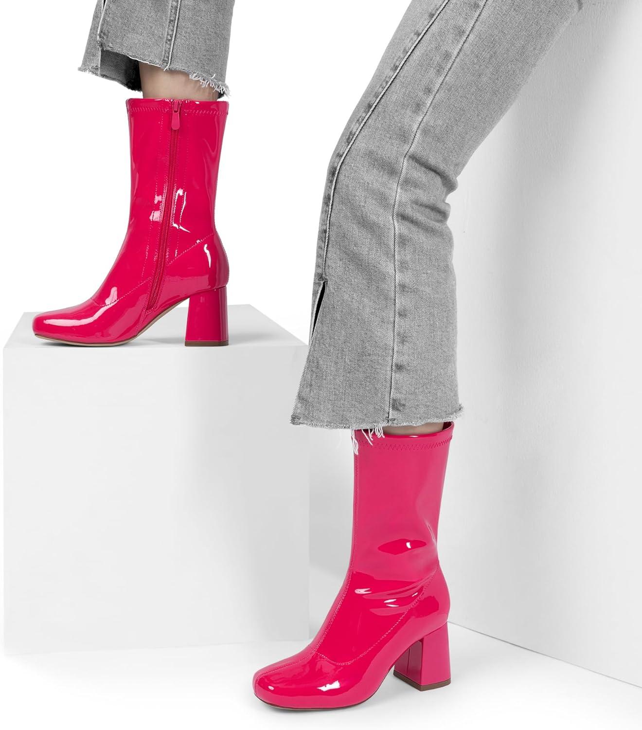 DREAM PAIRS Women’s Mid Calf Gogo Boots Low Block Heel Square Toe Ankle Boot with Zipper for Party Cosplay Dance(Hot Pink)