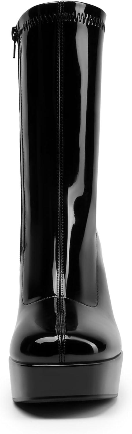 DREAM PAIRS Women’s Mid Calf Gogo Boots Platform High Chunky Block Heel Square Toe Ankle Boots(Black-pat)