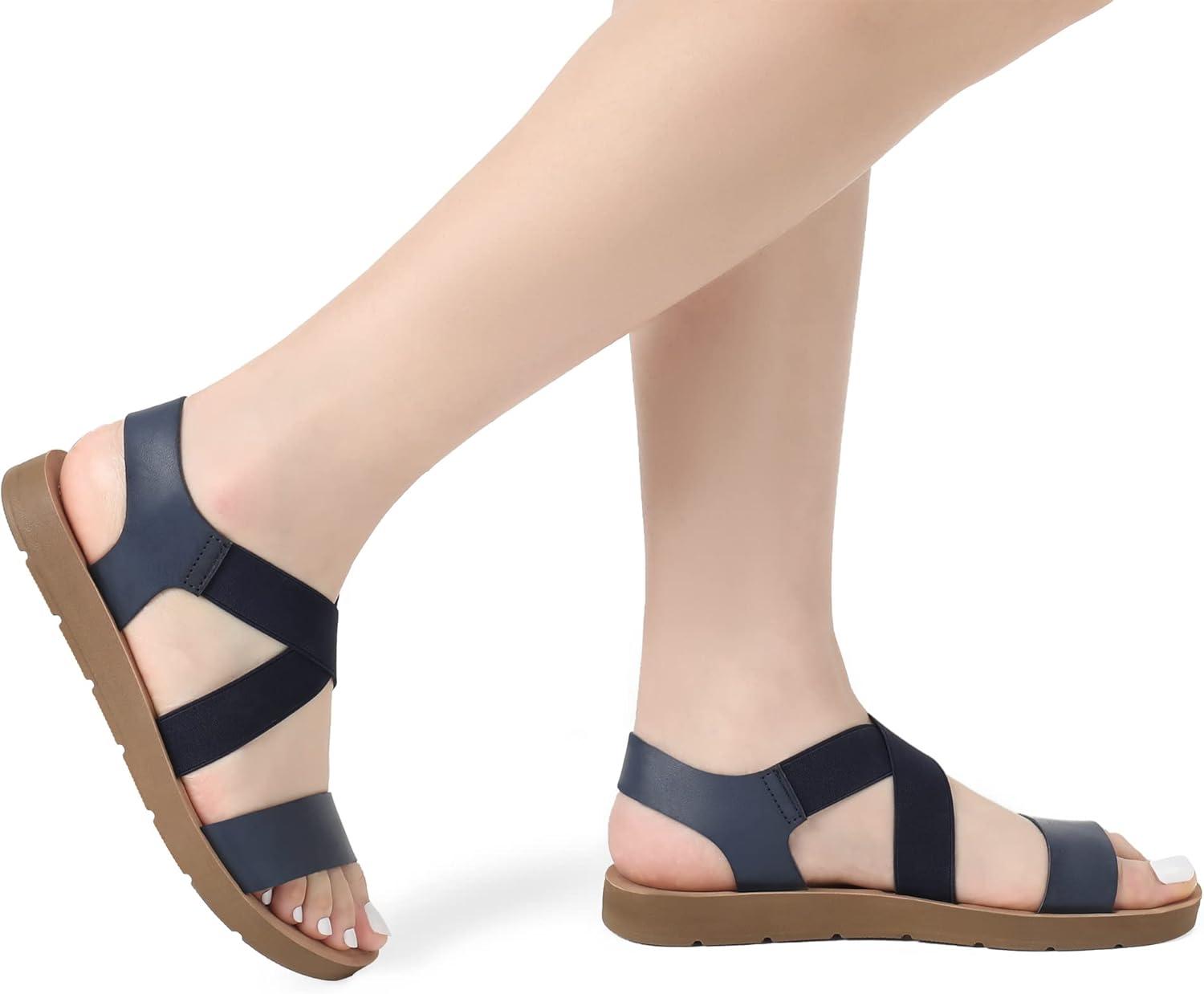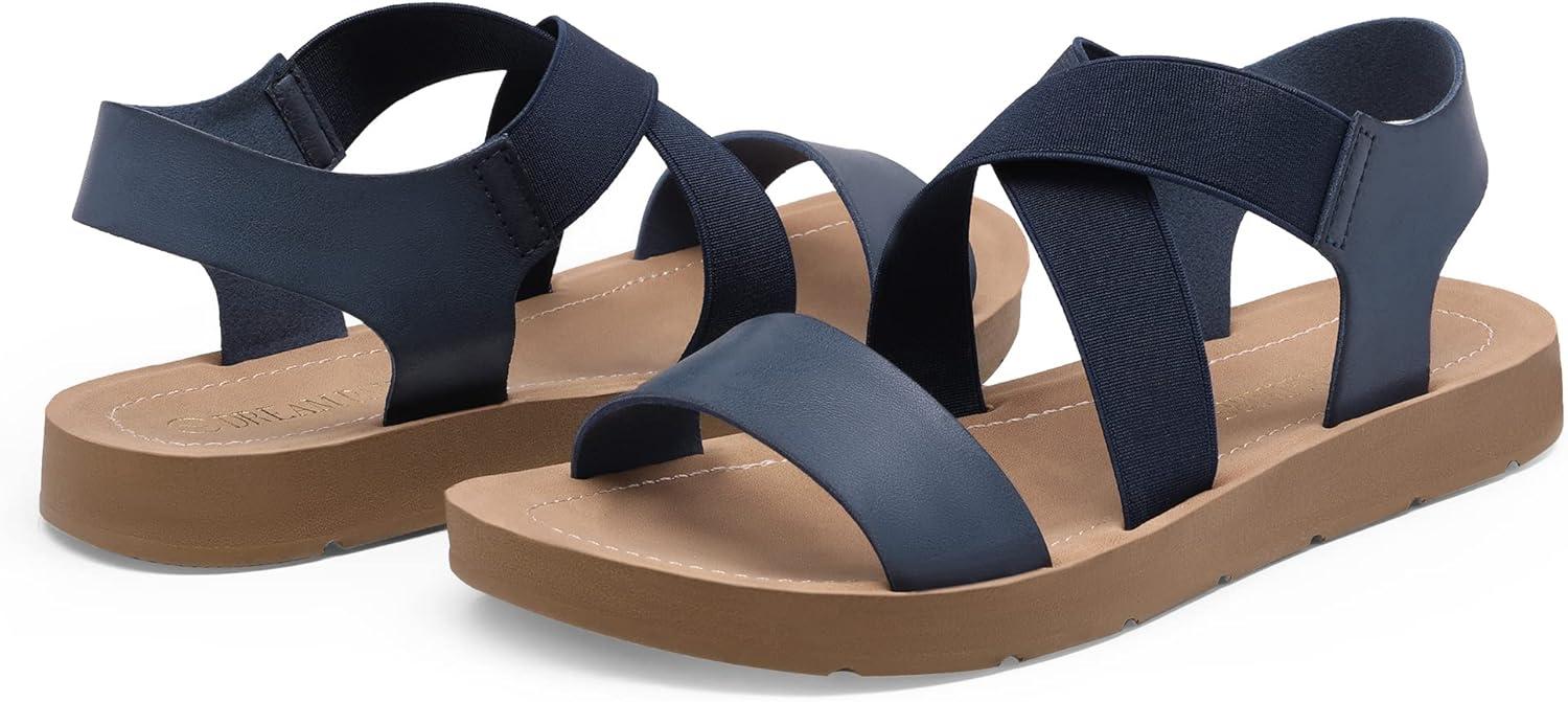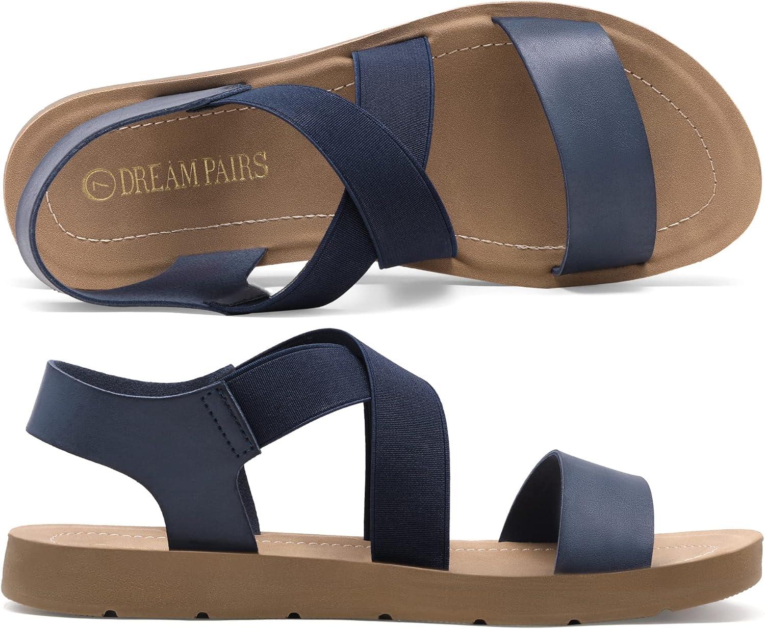DREAM PAIRS Women’s Open Toe Elastic Ankle Strap Flat Summer Sandals(Navy)