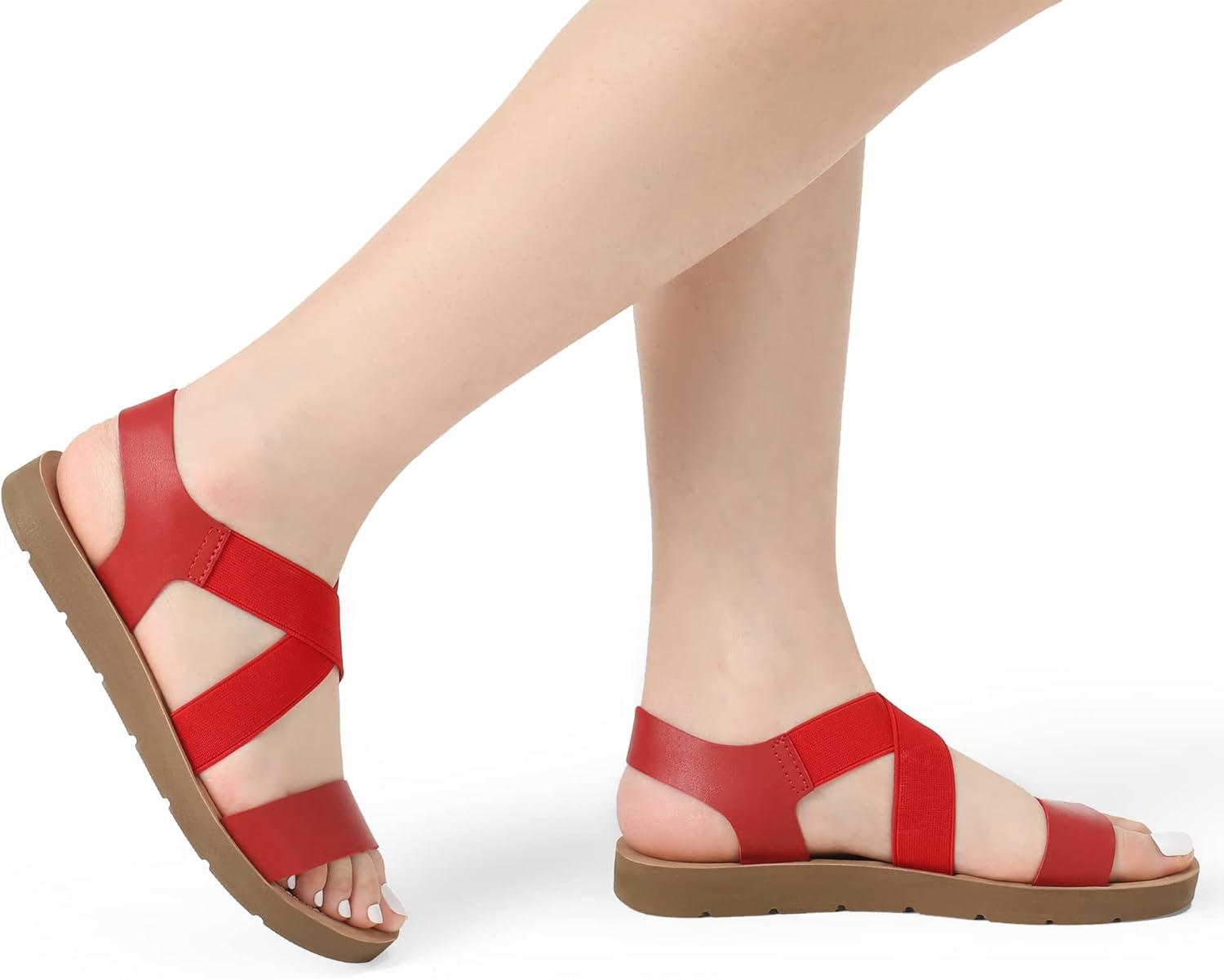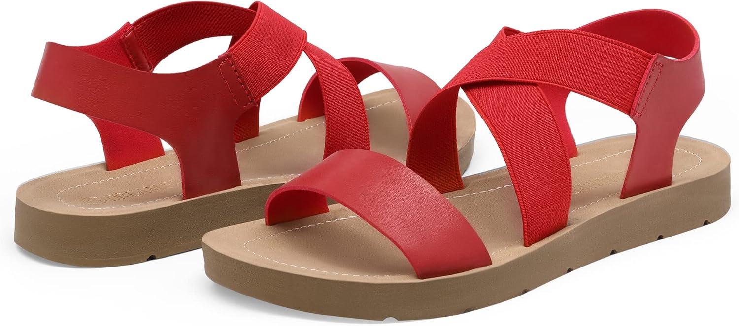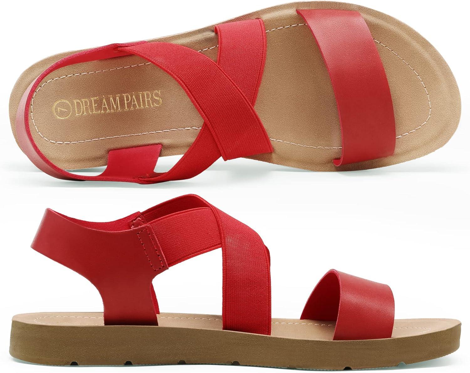DREAM PAIRS Women’s Open Toe Elastic Ankle Strap Flat Summer Sandals(Red)