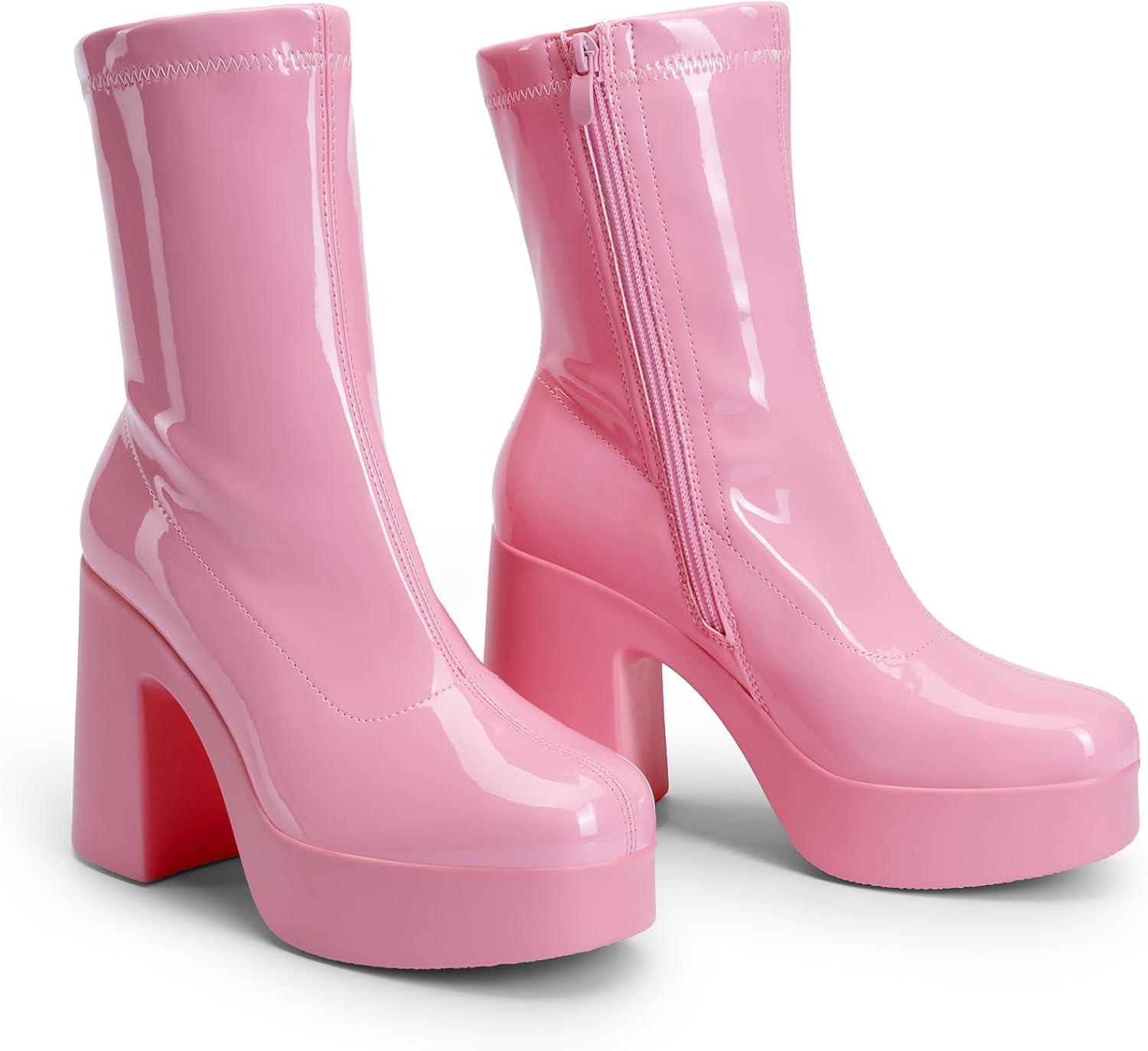 DREAM PAIRS Women’s Platform Gogo Ankle Boots High Chunky Block Heel Square Toe Booties Shoes(Pink)