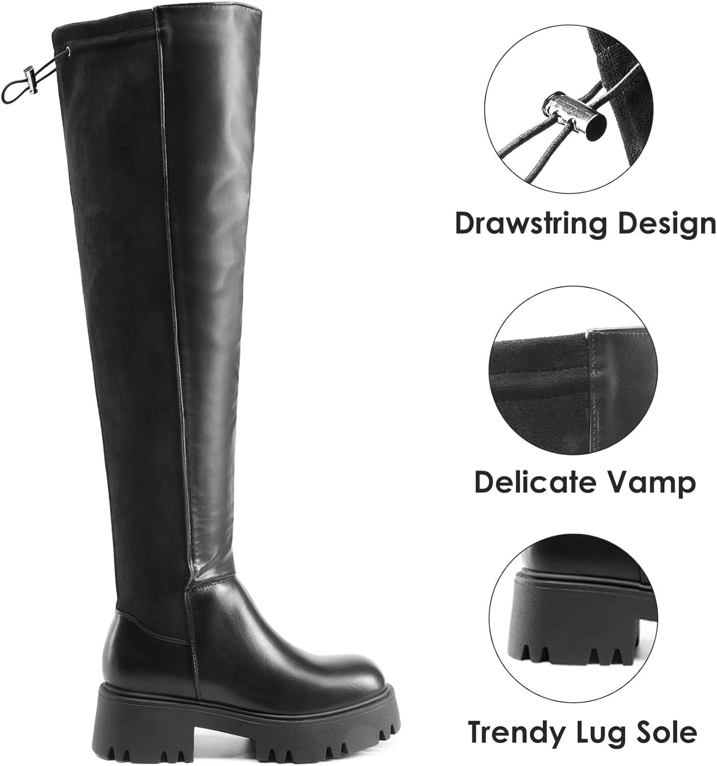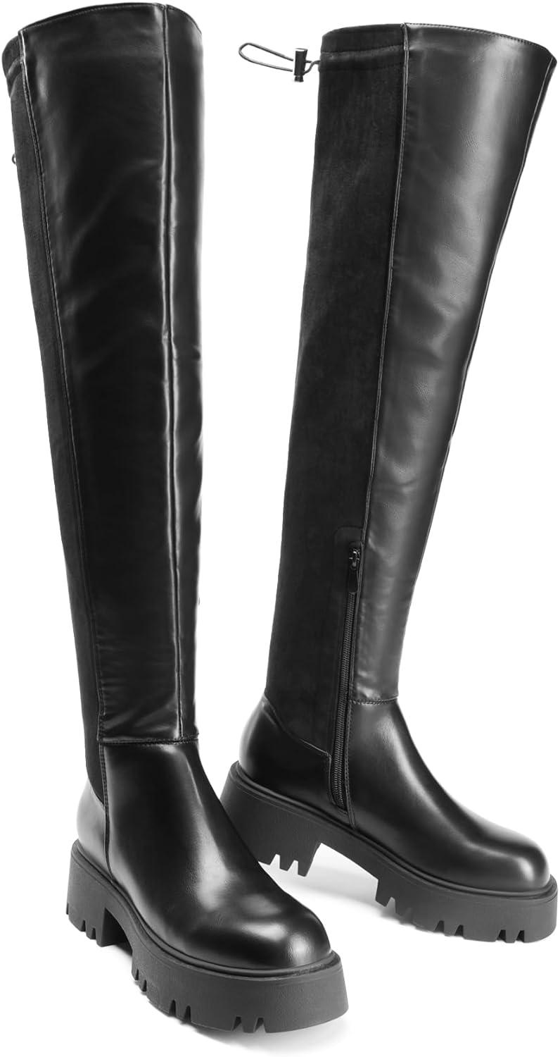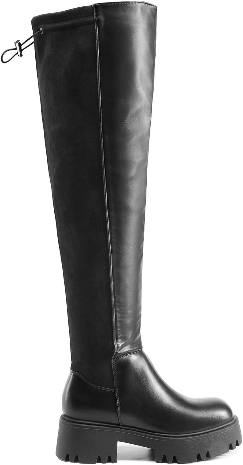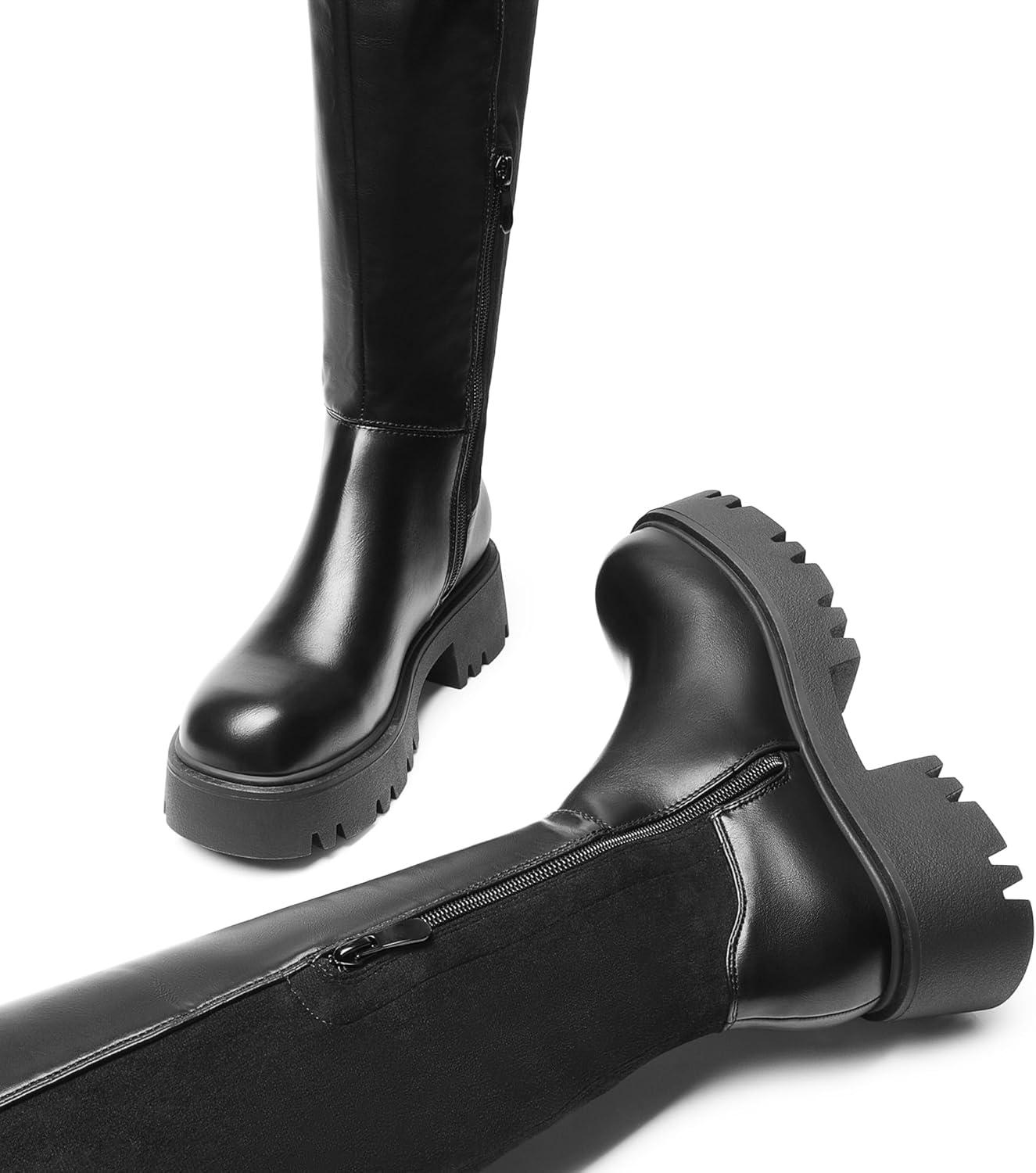 DREAM PAIRS Women’s Platform Over The Knee Boots Lug Sole Round Toe Thigh High Long Chunky Block Heels Fall Boots(Black-pu/Suede)