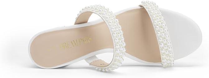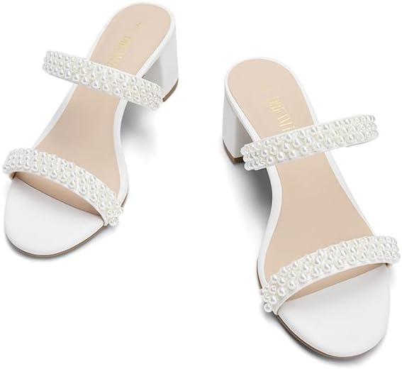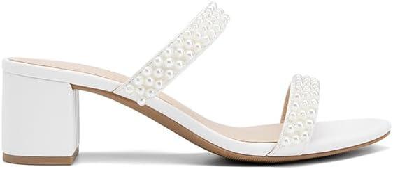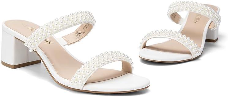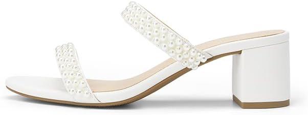 DREAM PAIRS Women’s Two Strap Open Toe Low Block Chunky Heels Sandals Dress Pumps Casual Summer Mules Shoes(White-pearl)